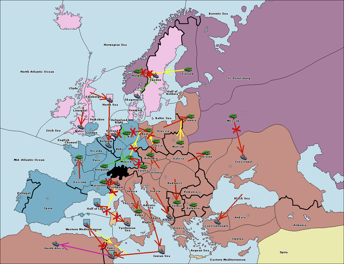 The fleet at Ionian Sea support move to Tyrrhenian Sea from Tunis.