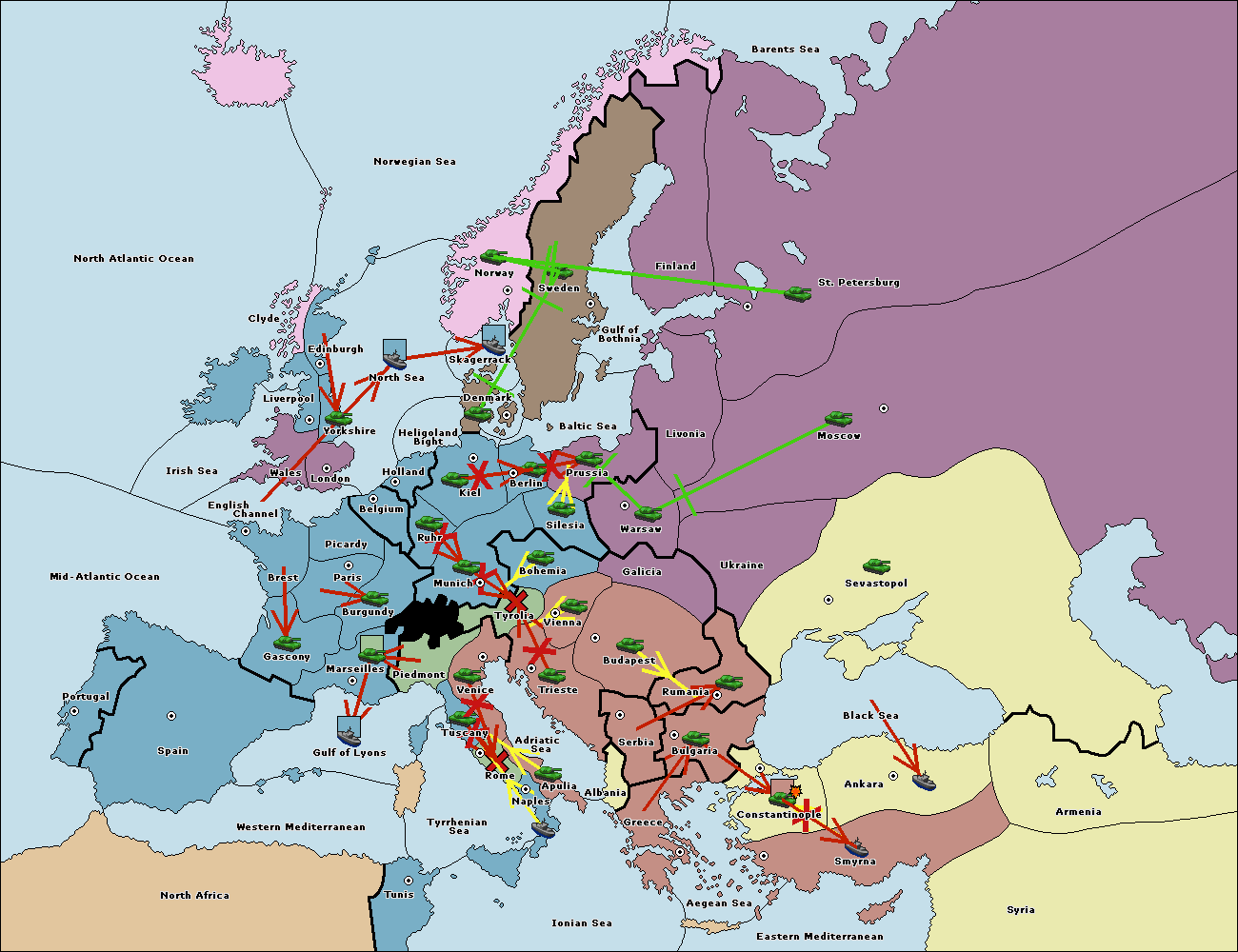 The fleet at Greece support move to Bulgaria from Constantinople.