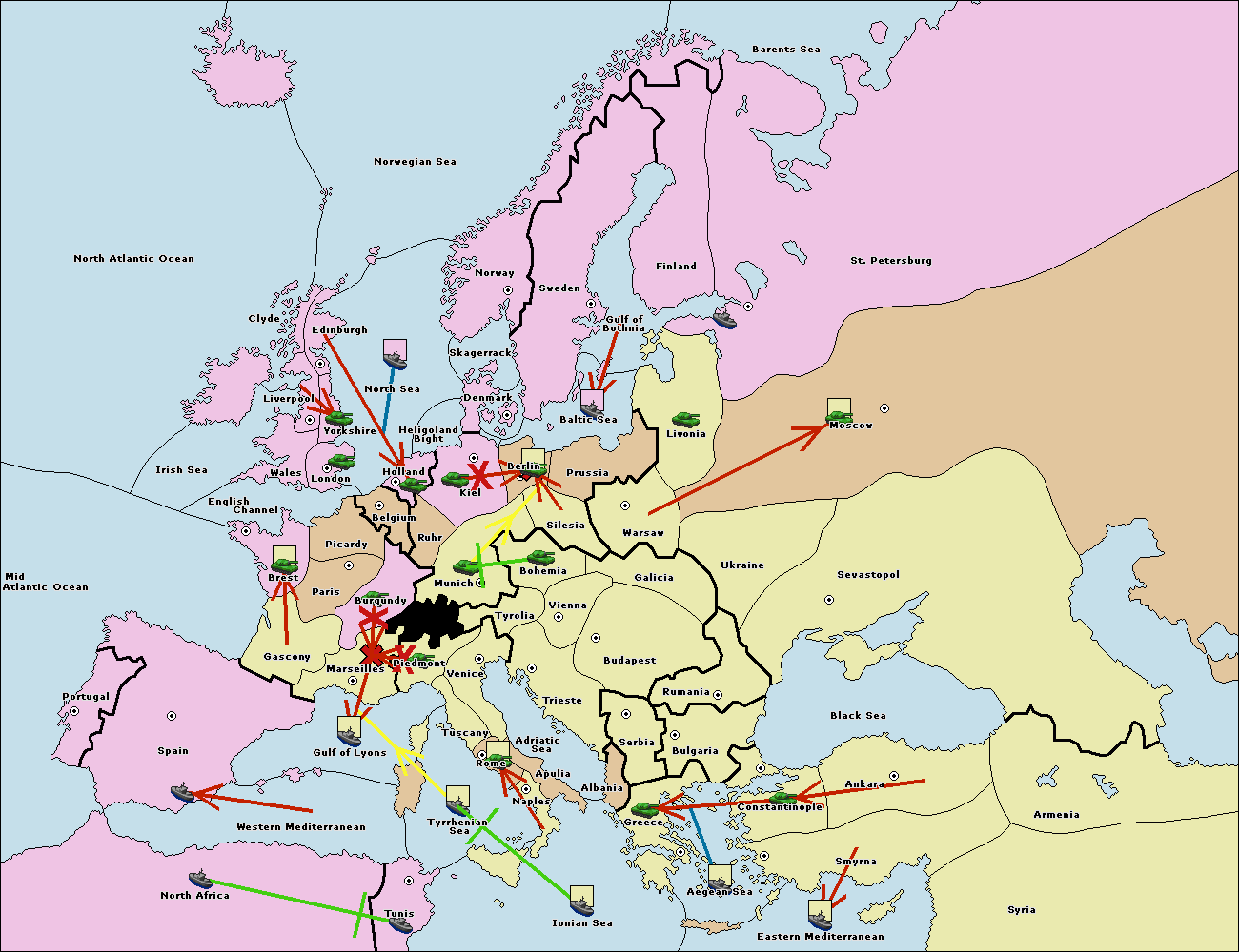 The fleet at Spain (South Coast) support move to Marseilles from Burgundy.