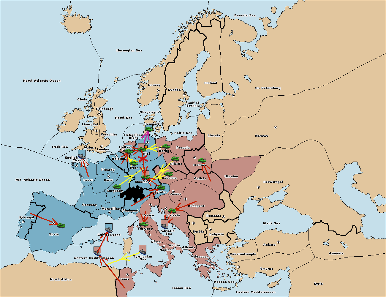The fleet at Tyrrhenian Sea support move to Tunis from Ionian Sea.