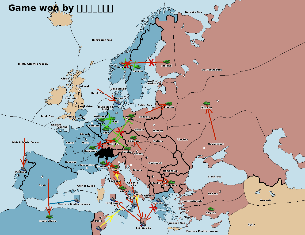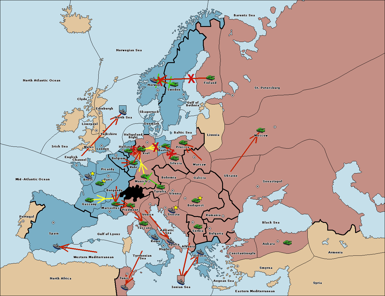 The fleet at Ionian Sea support move to Tyrrhenian Sea from Tunis.