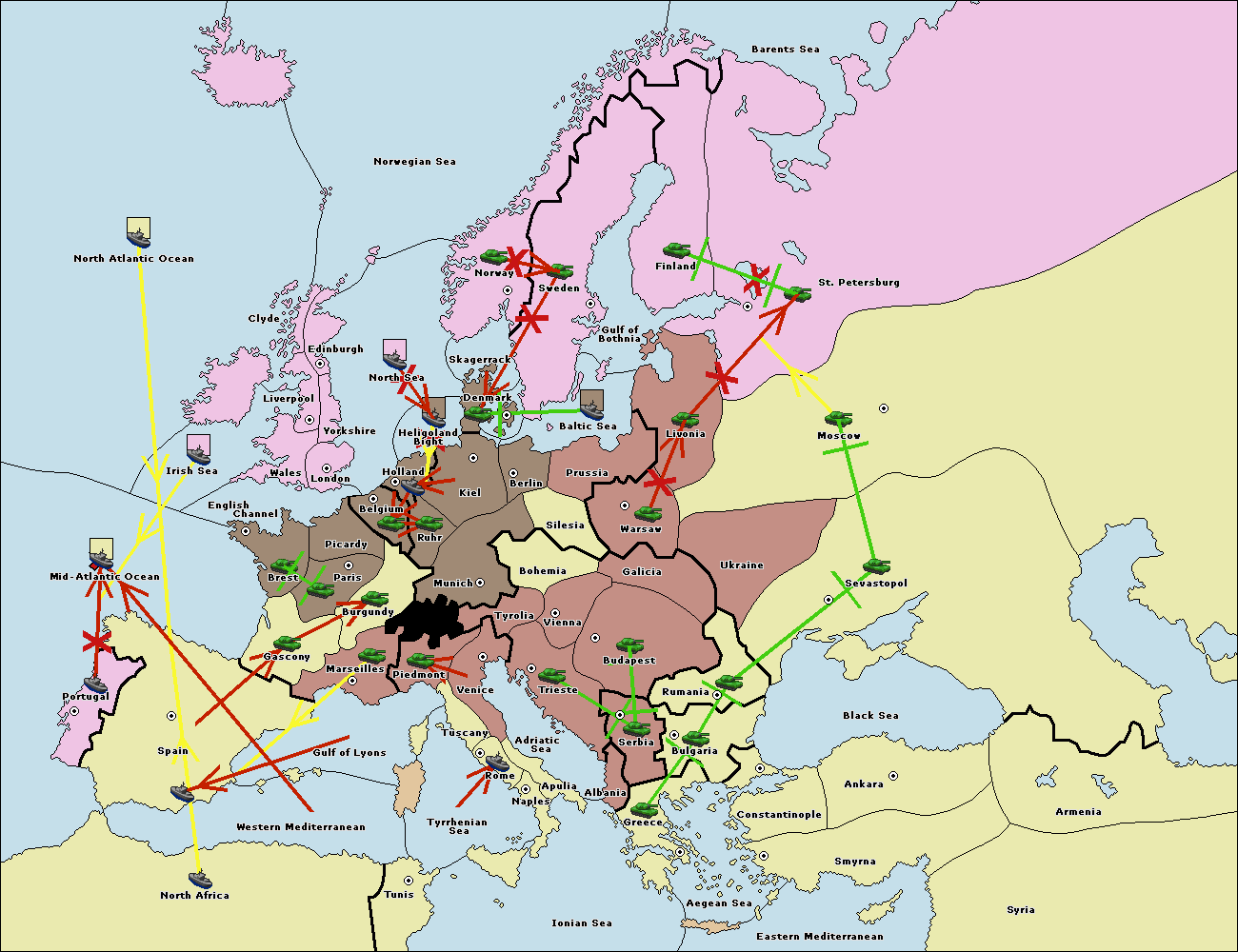 The fleet at Spain (South Coast) support move to Gulf of Lyons from Western Mediterranean.