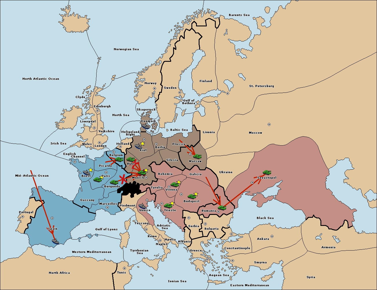 The fleet at Brest move to Mid-Atlantic Ocean.