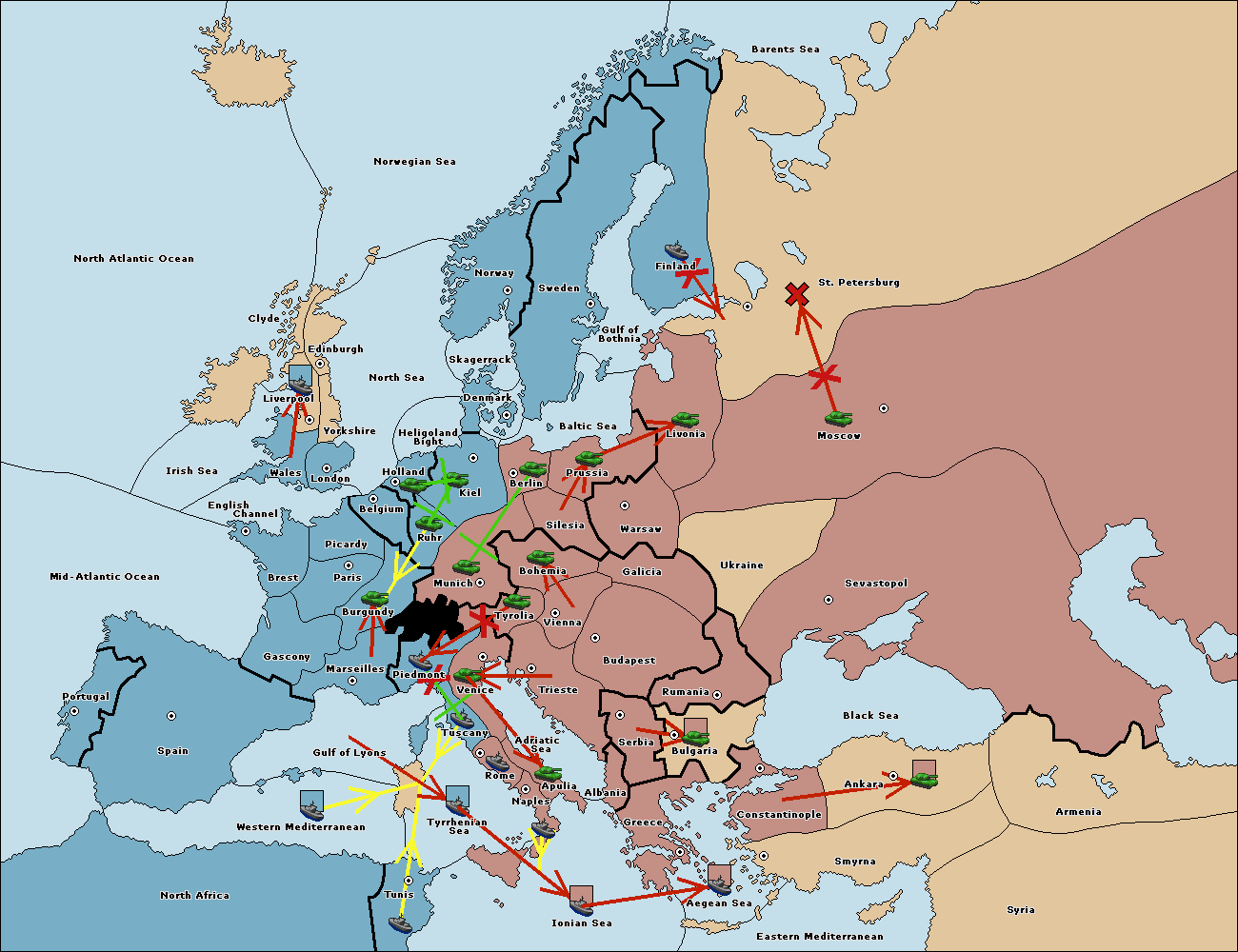 The fleet at Tyrrhenian Sea support move to Tunis from Ionian Sea.