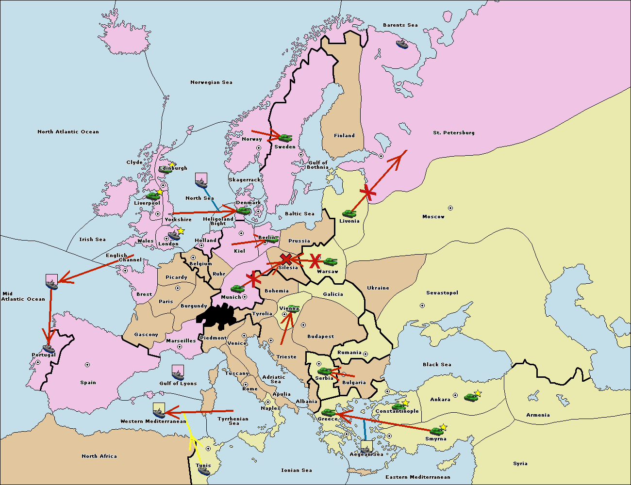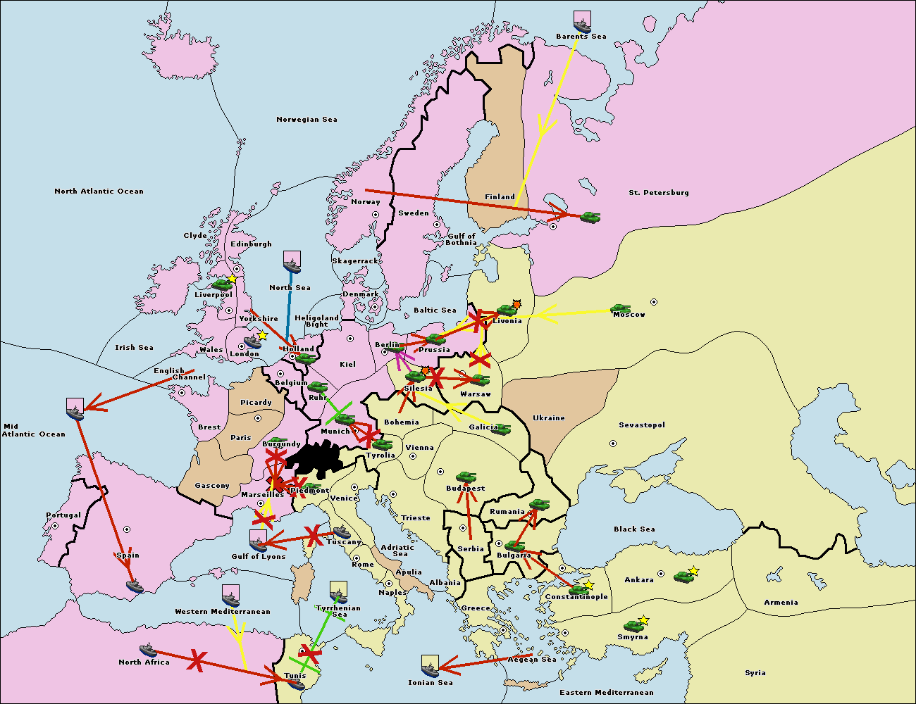 The fleet at Mid-Atlantic Ocean support move to Western Mediterranean from Gulf of Lyons.