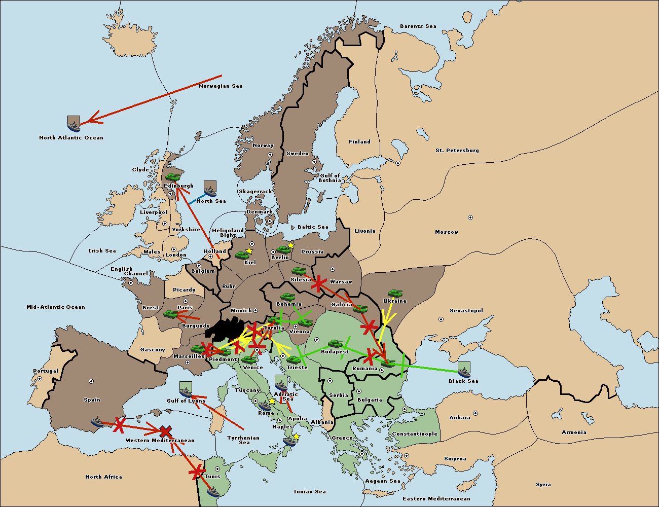 The army at Tyrolia support move to Piedmont from Marseilles.