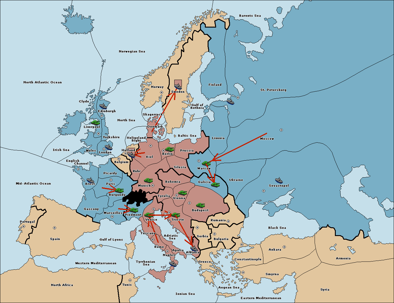 The army at Tyrolia support move to Vienna from Bohemia.