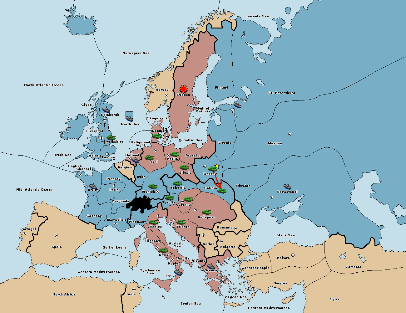 The army at Warsaw move to Galicia.