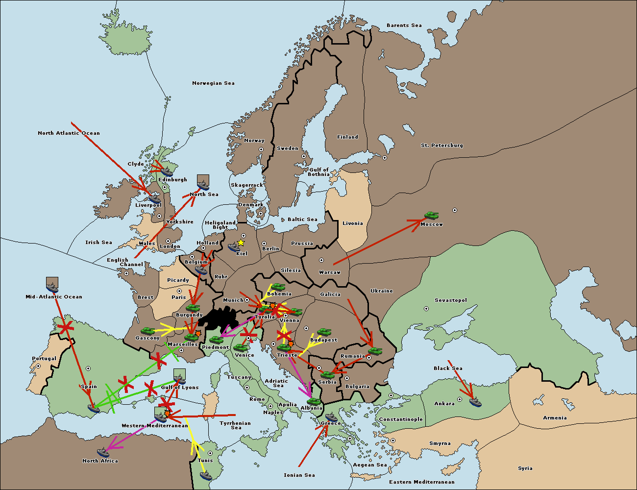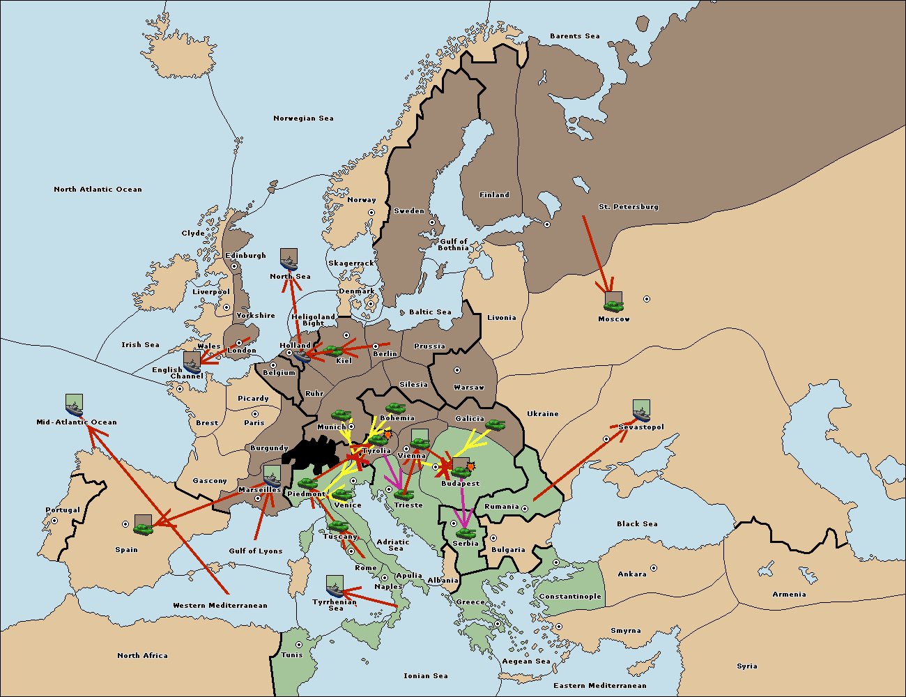 The fleet at Spain (South Coast) support move to Marseilles from Tuscany.