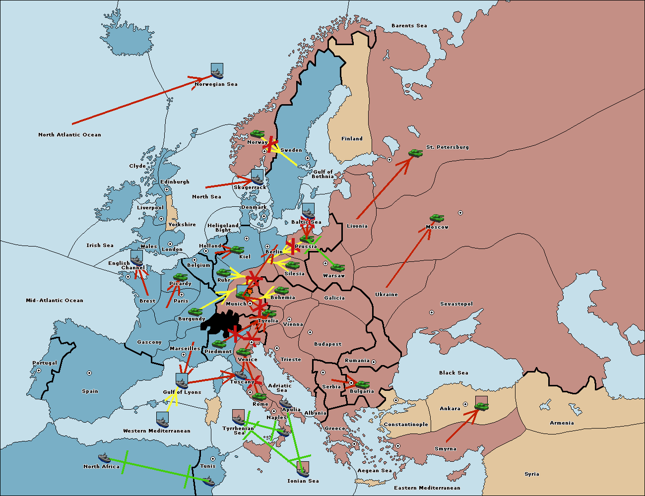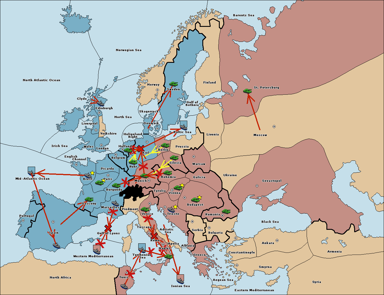 The fleet at Spain (South Coast) support move to Gulf of Lyons from Marseilles.