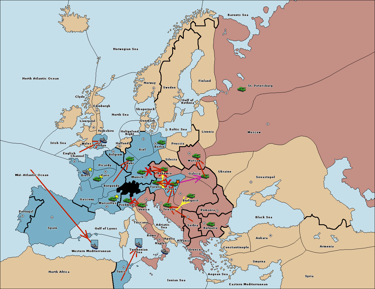 The fleet at Mid-Atlantic Ocean move to Western Mediterranean.