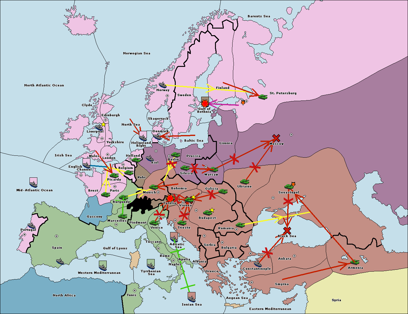 The fleet at St. Petersburg (South Coast) retreat to Gulf of Bothnia.
