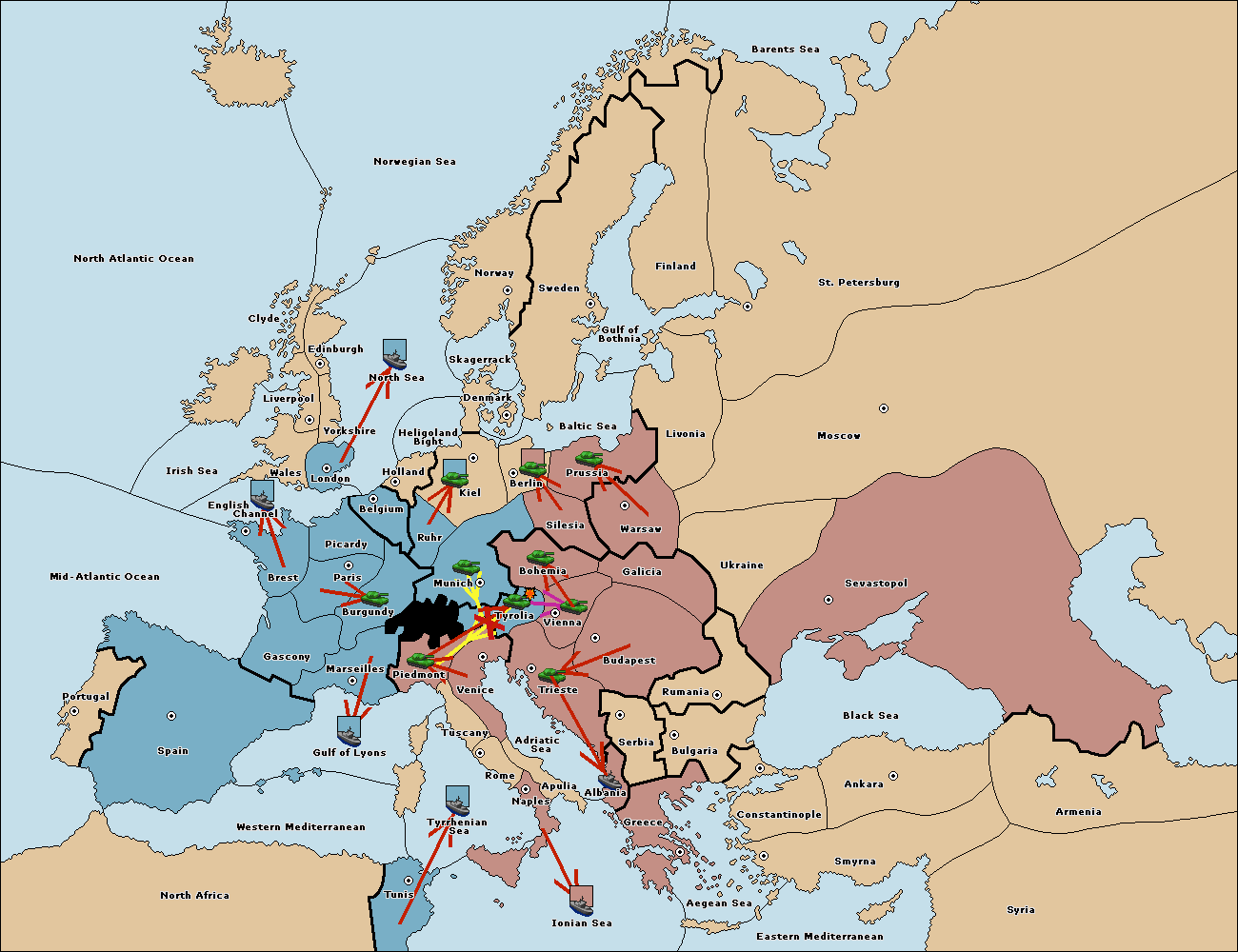 The army at Munich support move to Tyrolia from Piedmont.