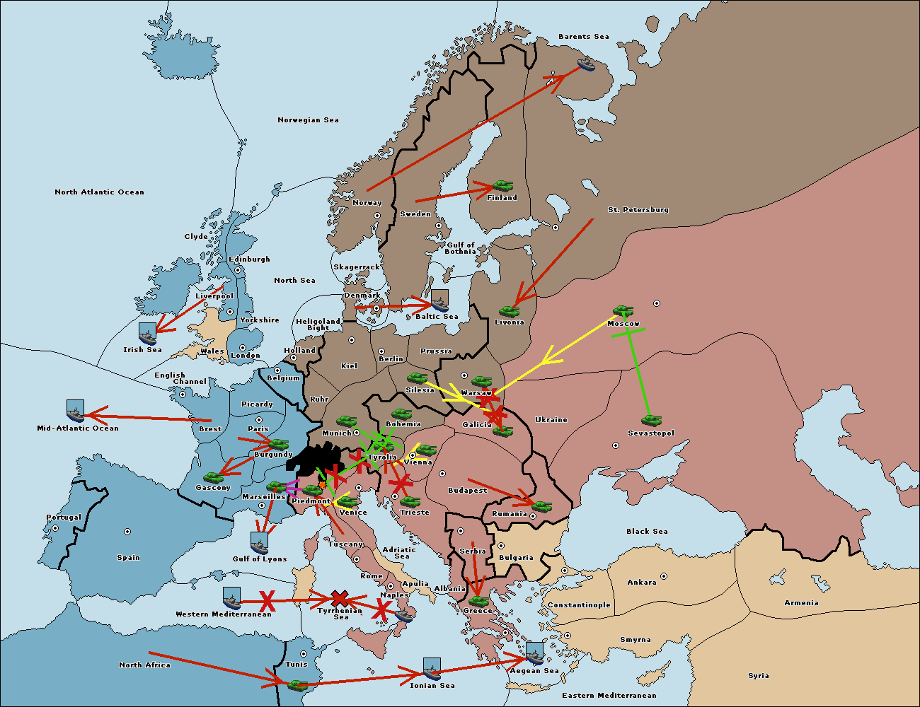 The army at Tyrolia support move to Piedmont from Marseilles.