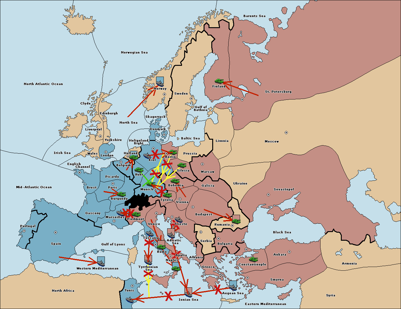 The fleet at Tyrrhenian Sea support move to Tunis from Ionian Sea.