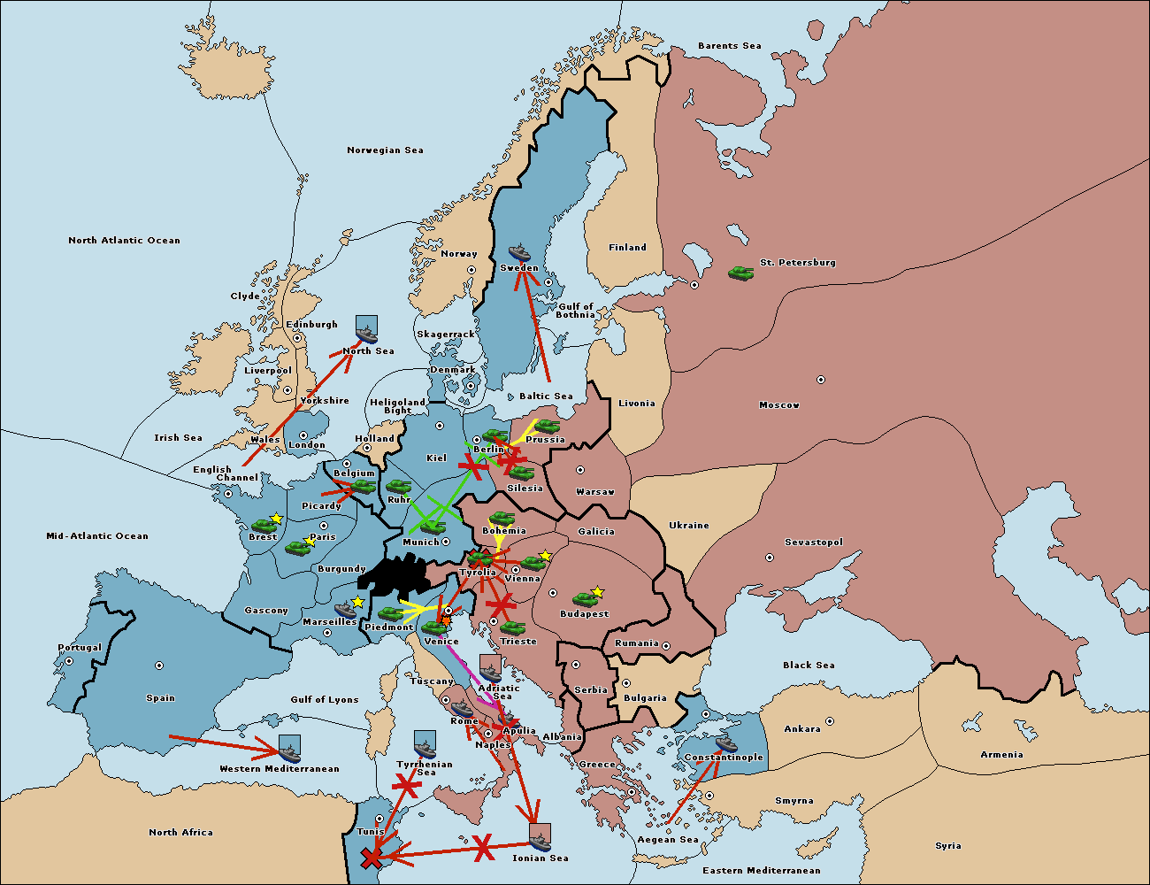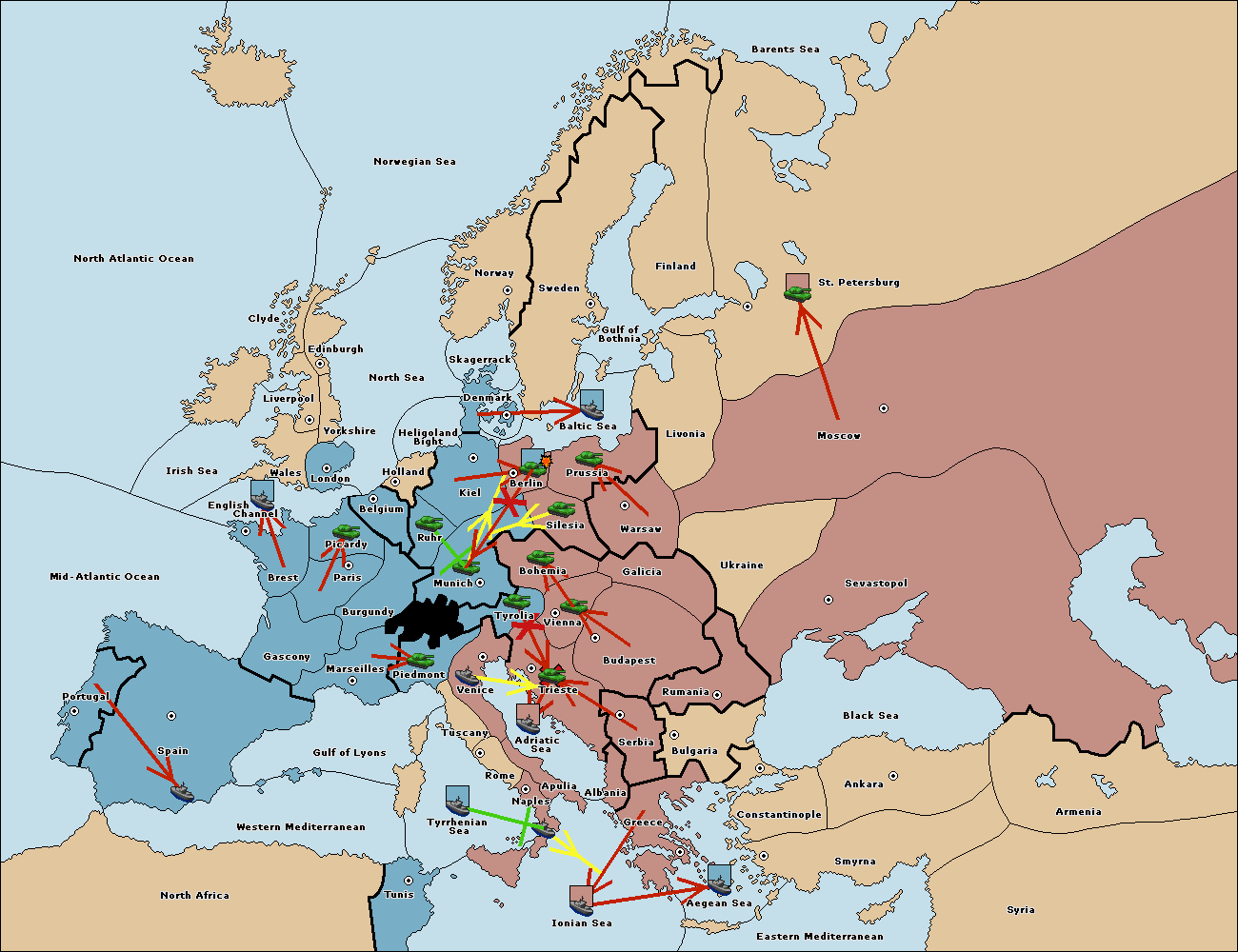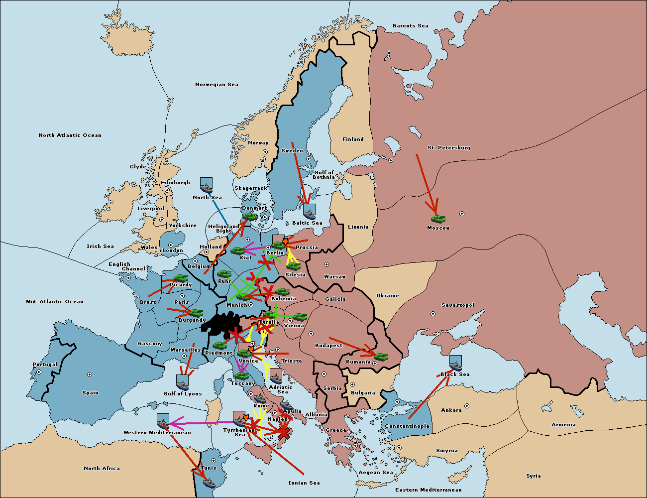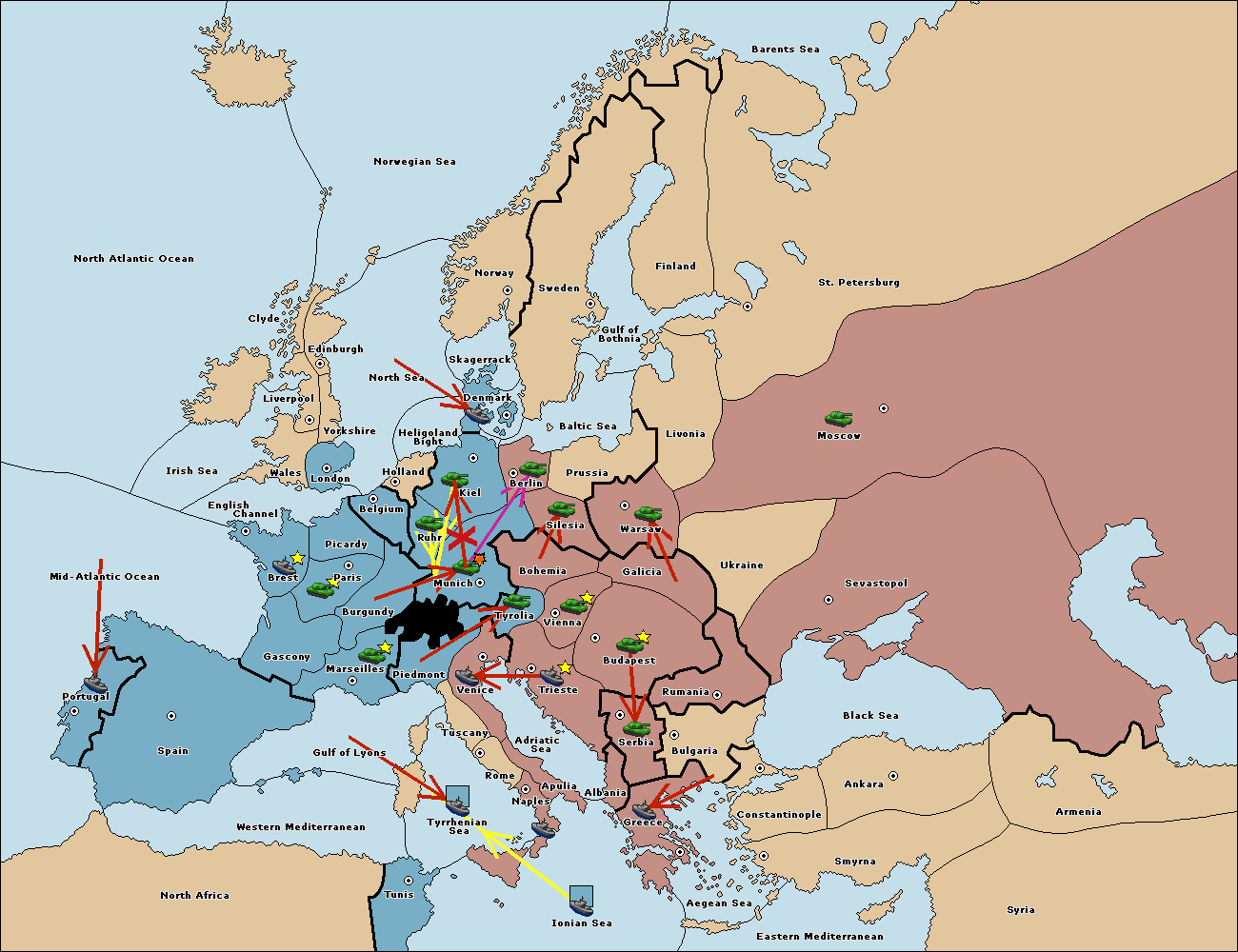 The fleet at Ionian Sea support move to Tyrrhenian Sea from Gulf of Lyons.