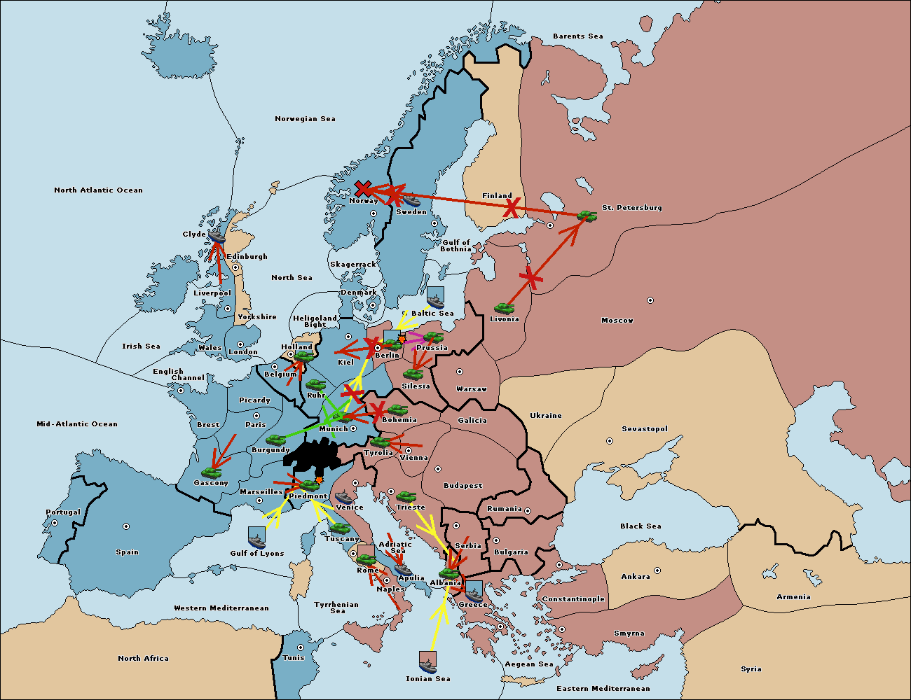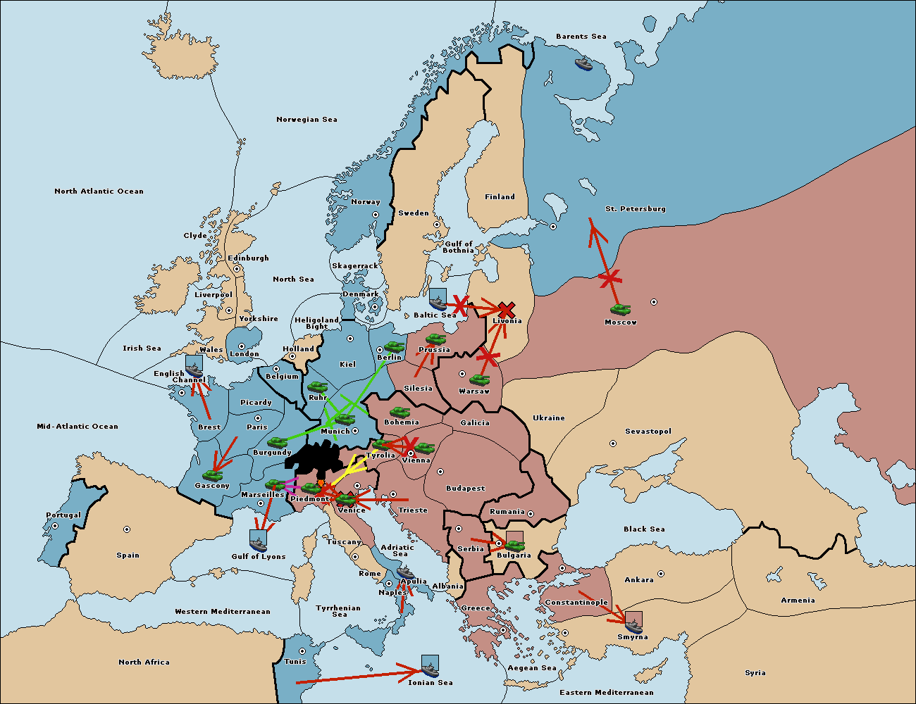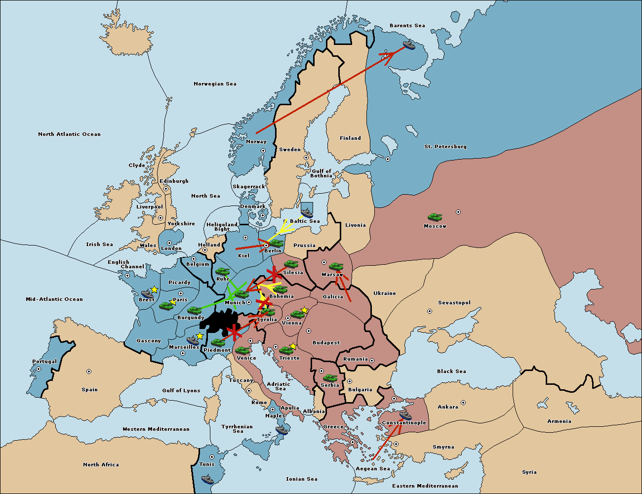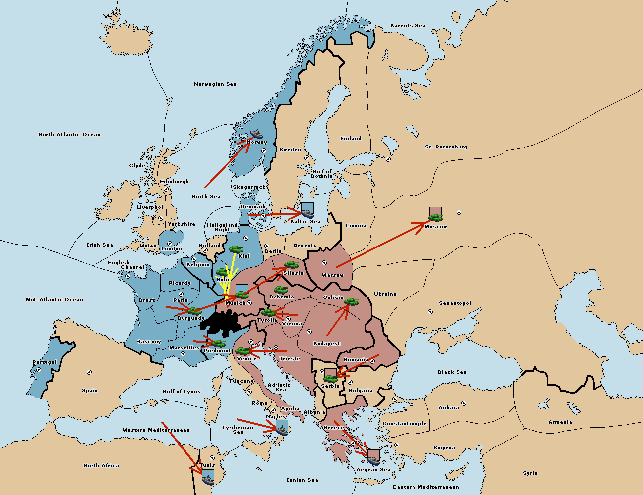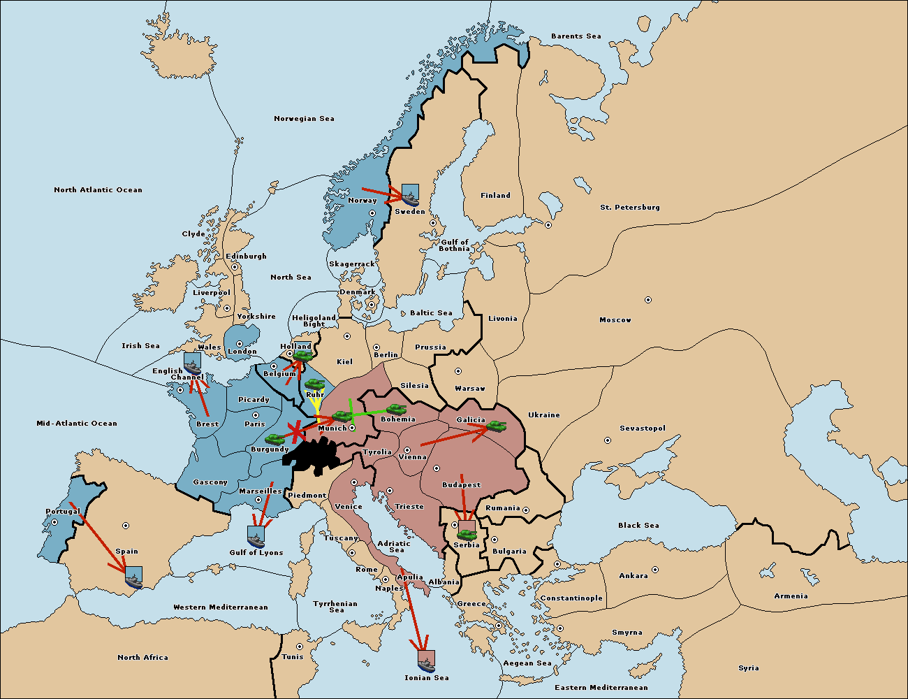 The army at Tyrolia support move to Munich from Silesia.