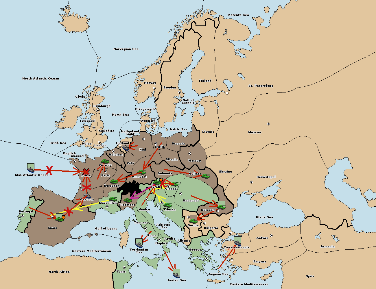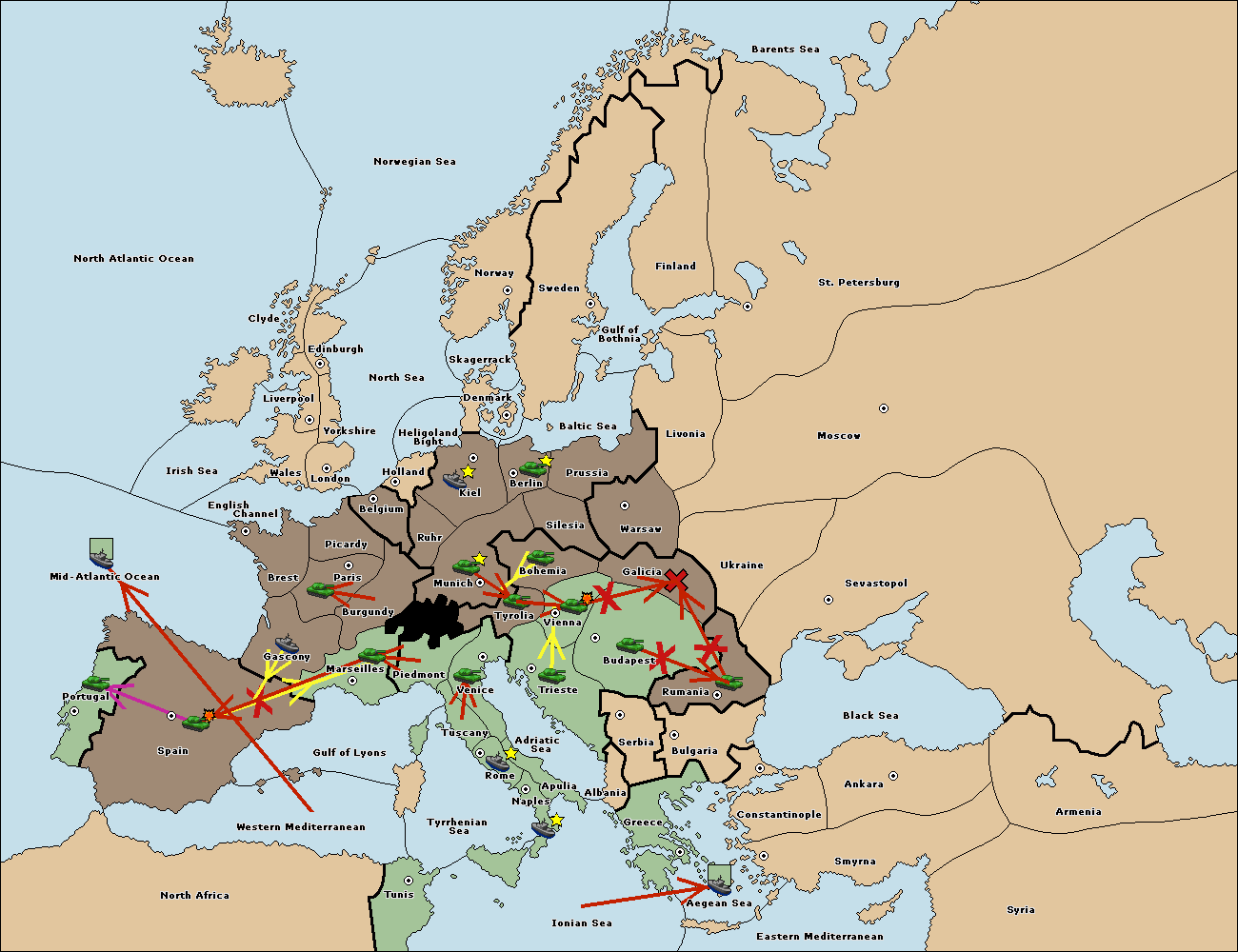 The fleet at North Africa move to Mid-Atlantic Ocean.
