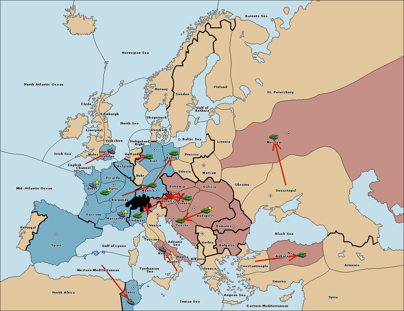 The fleet at Mid-Atlantic Ocean move to Western Mediterranean.