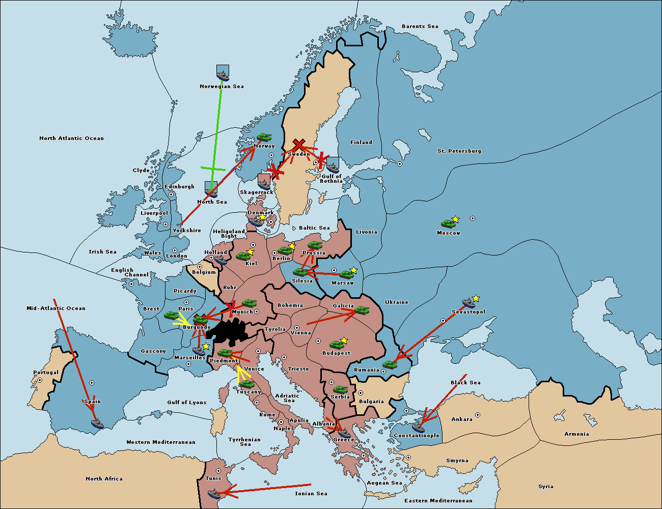 The fleet at Mid-Atlantic Ocean move to Western Mediterranean.