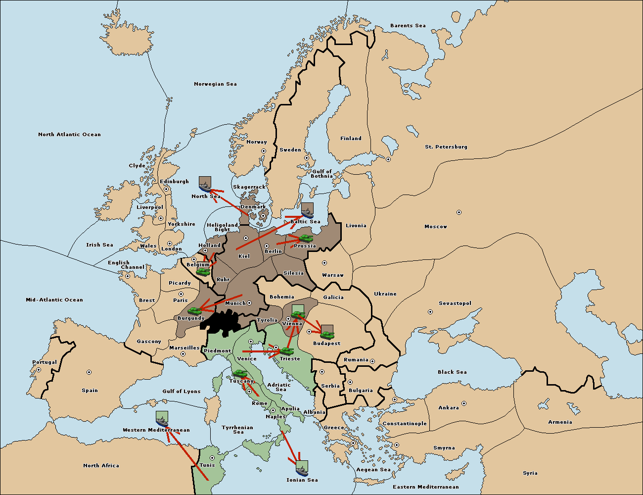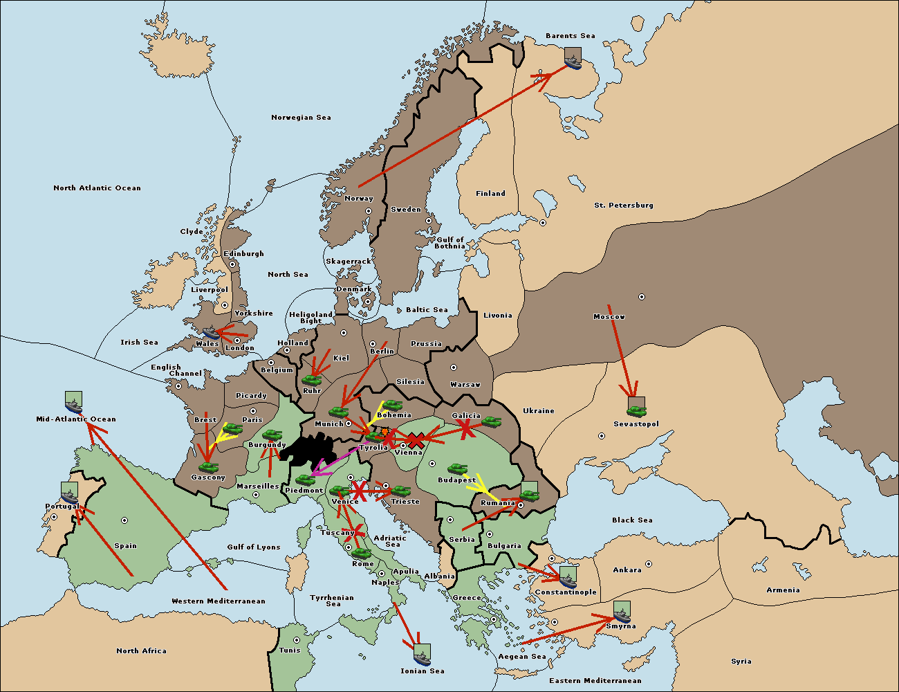 The fleet at Bulgaria (South Coast) move to Constantinople.
