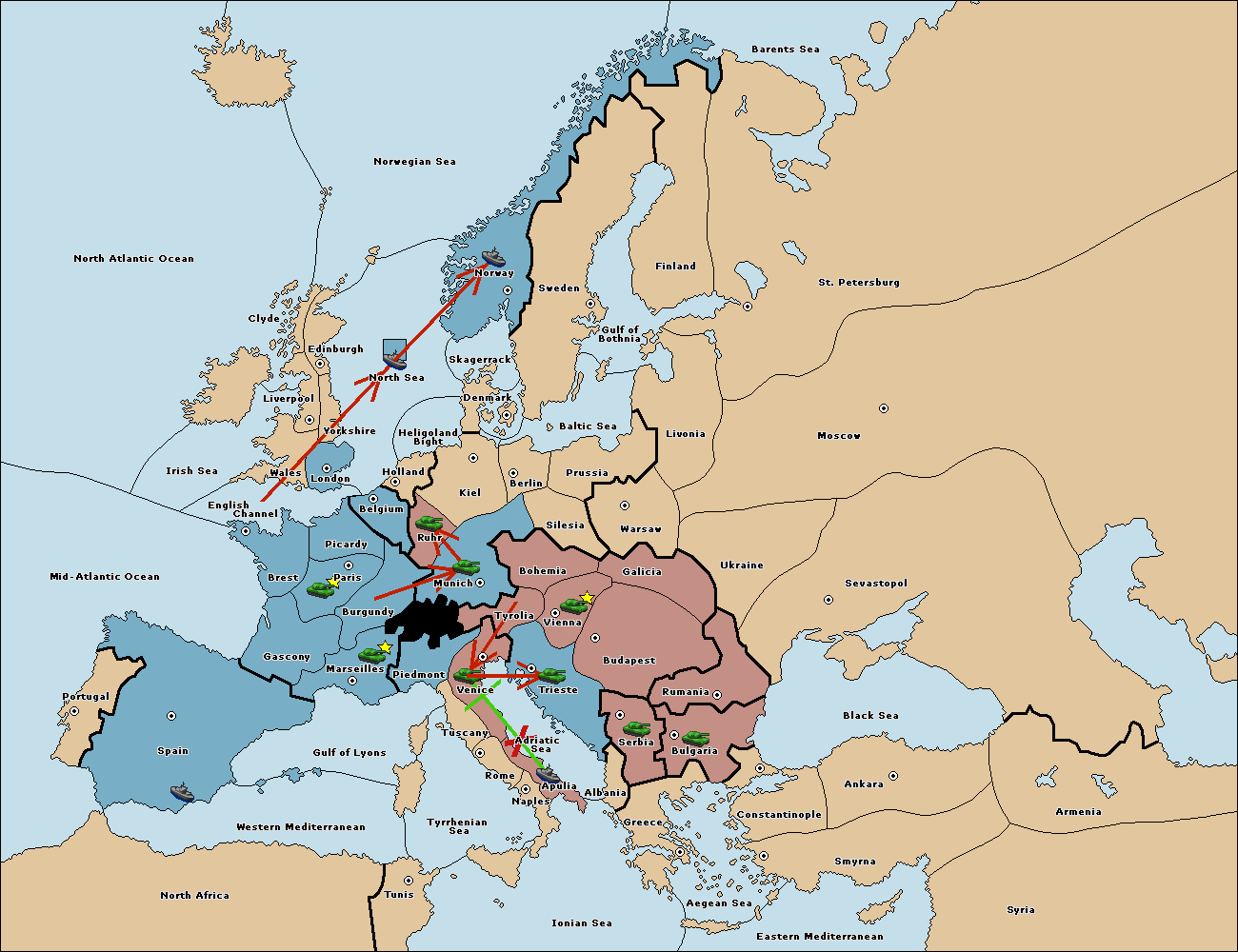 The fleet at Mid-Atlantic Ocean move to Western Mediterranean.