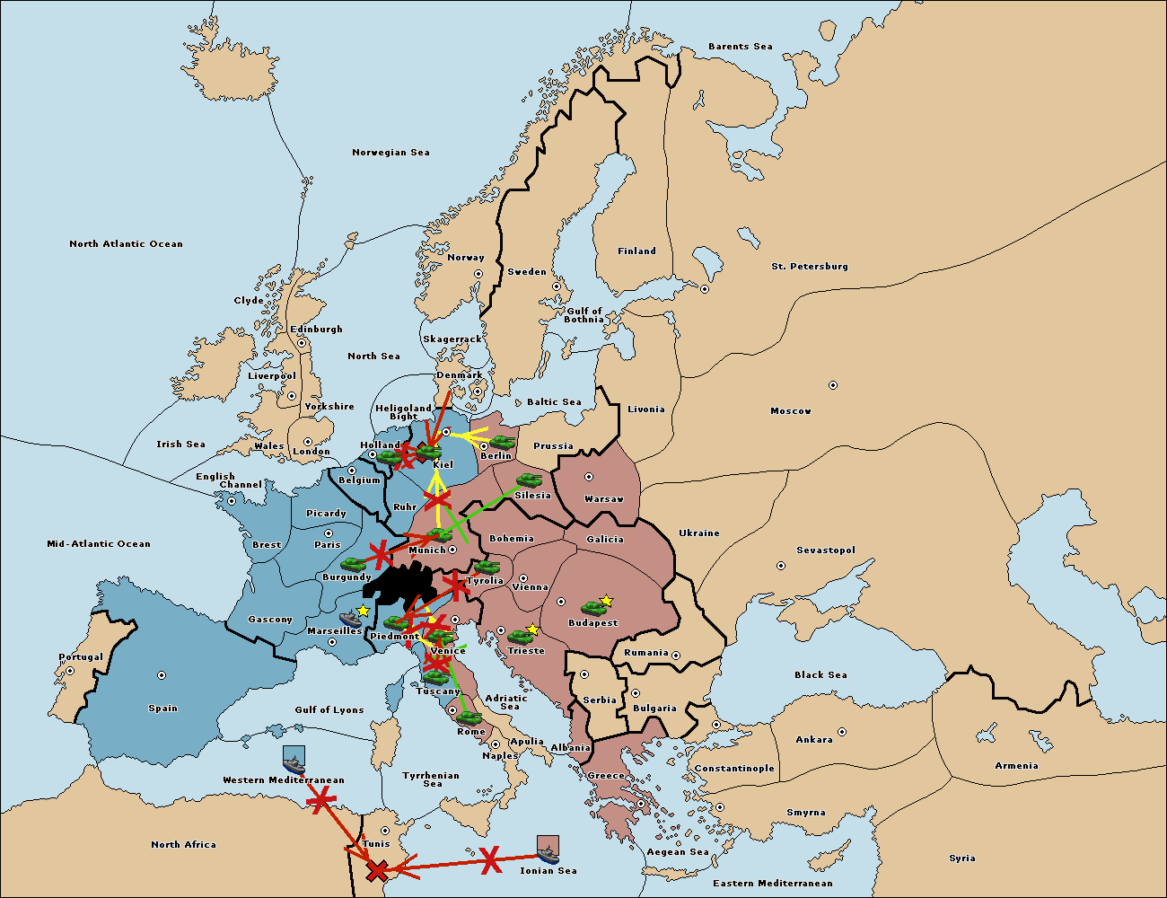 The fleet at Gulf of Lyons move to Tyrrhenian Sea.