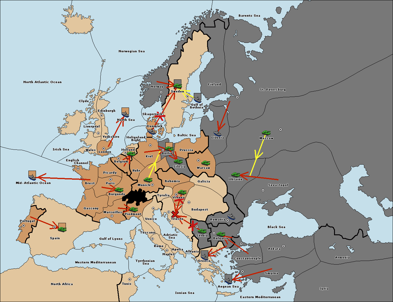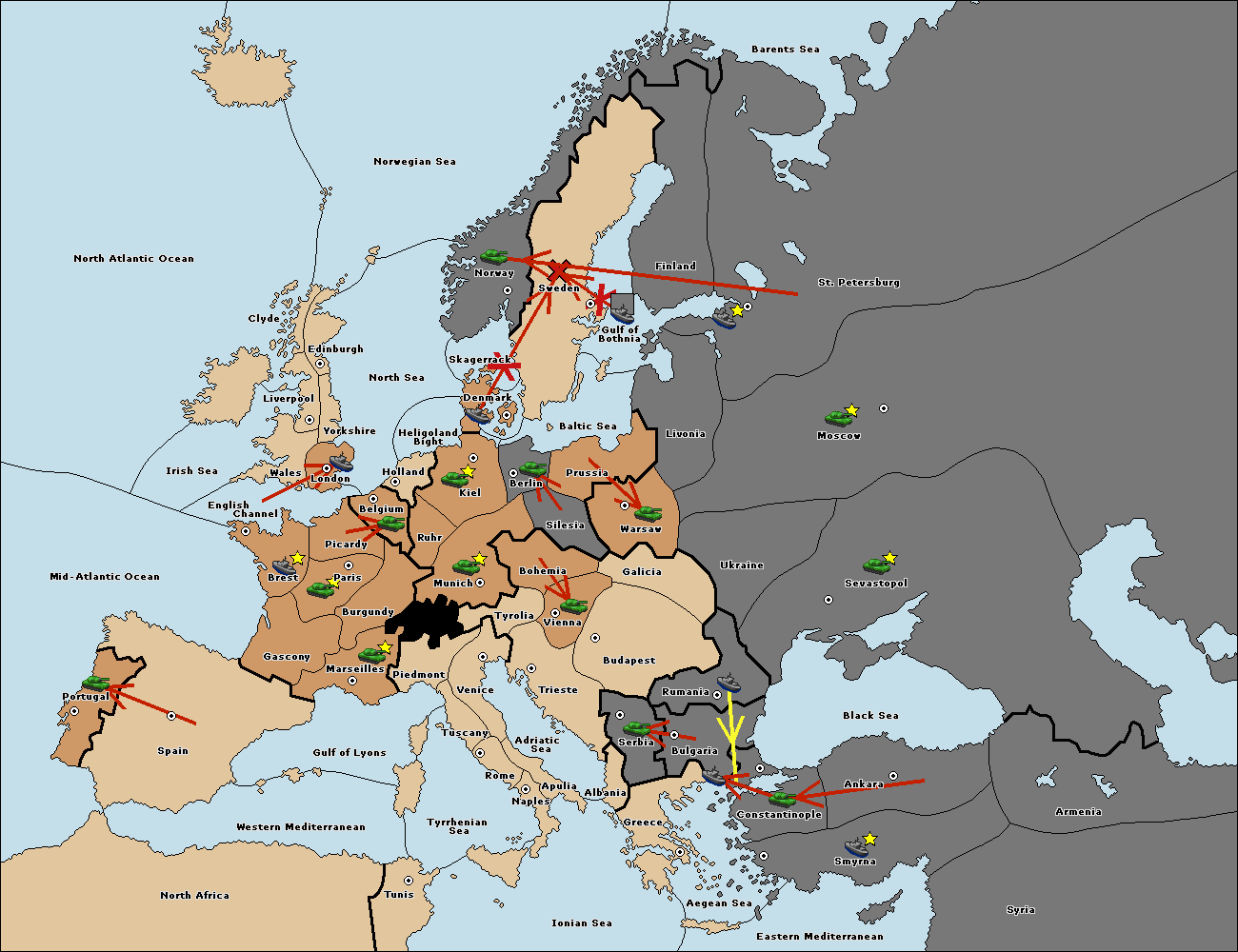 The fleet at Rumania support move to Bulgaria from Constantinople.