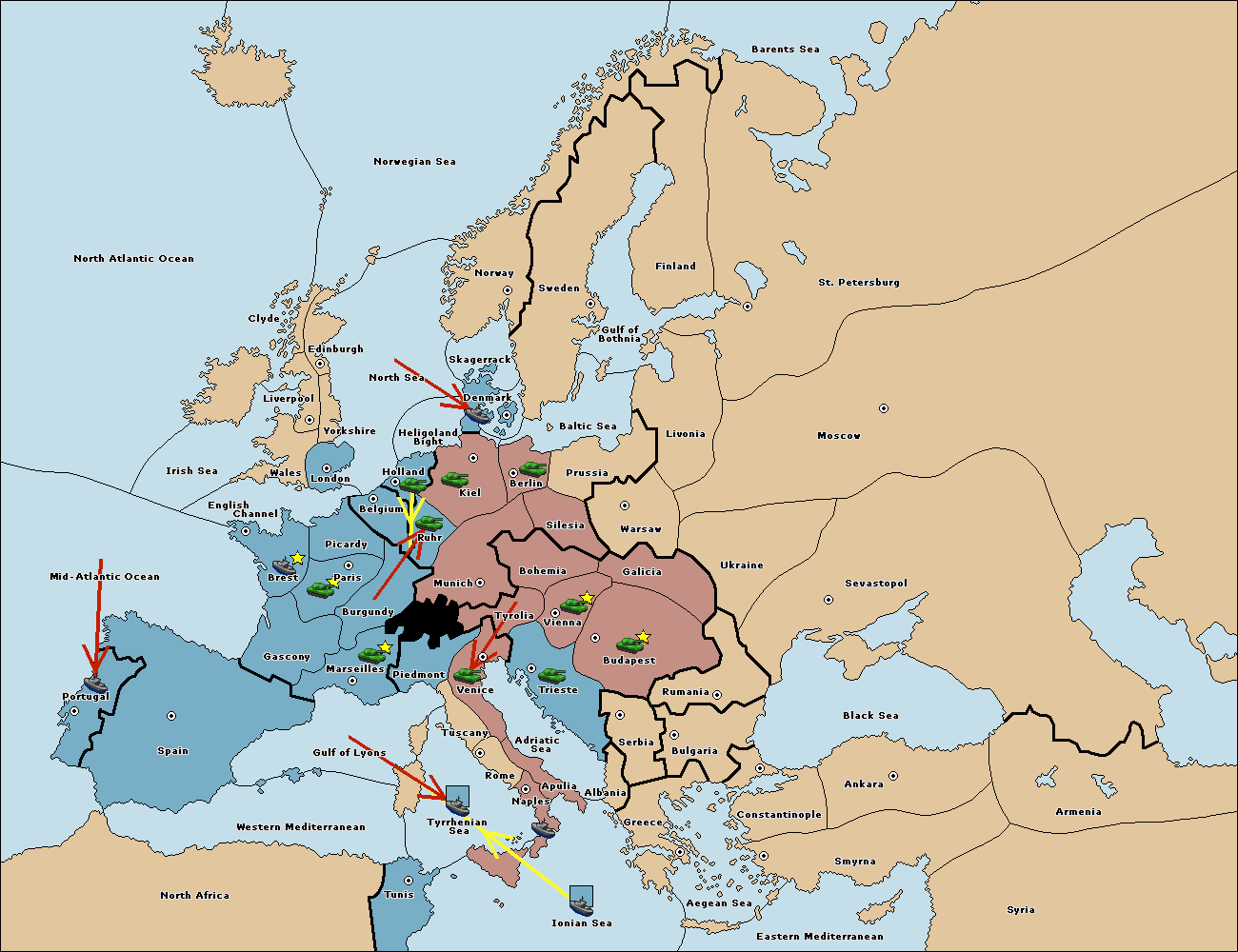 The fleet at Ionian Sea support move to Tyrrhenian Sea from Gulf of Lyons.