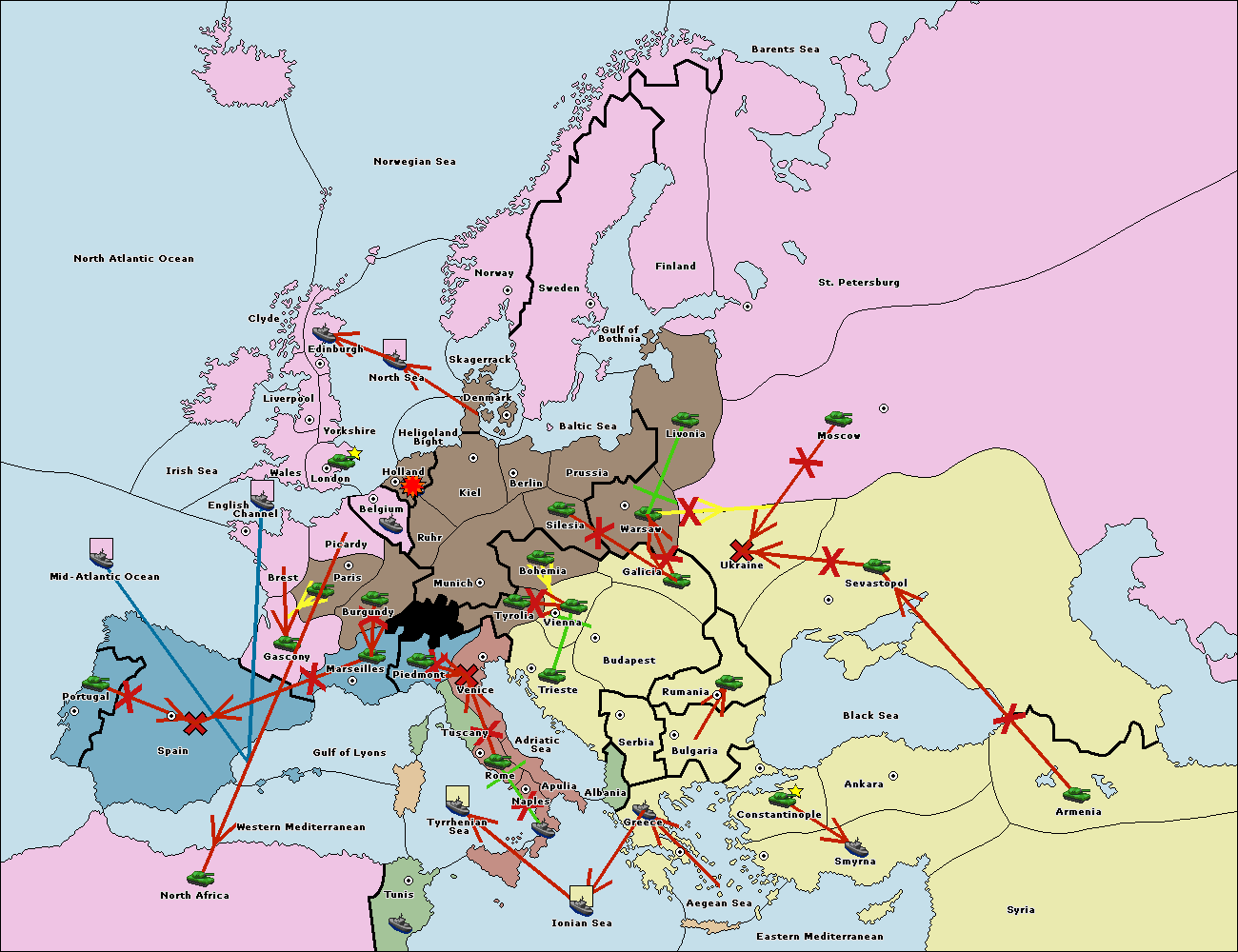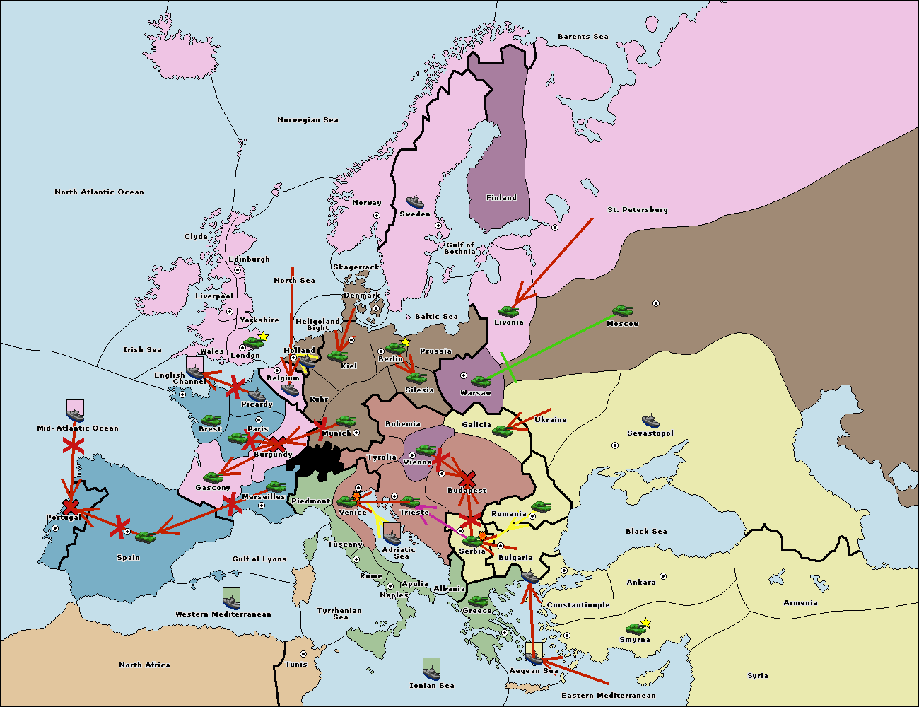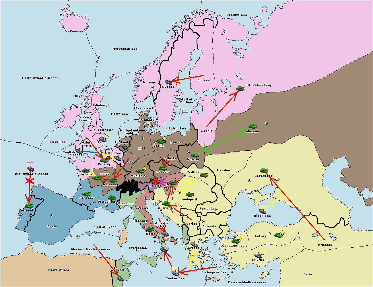 The fleet at Tyrrhenian Sea support move to Tunis from Ionian Sea.