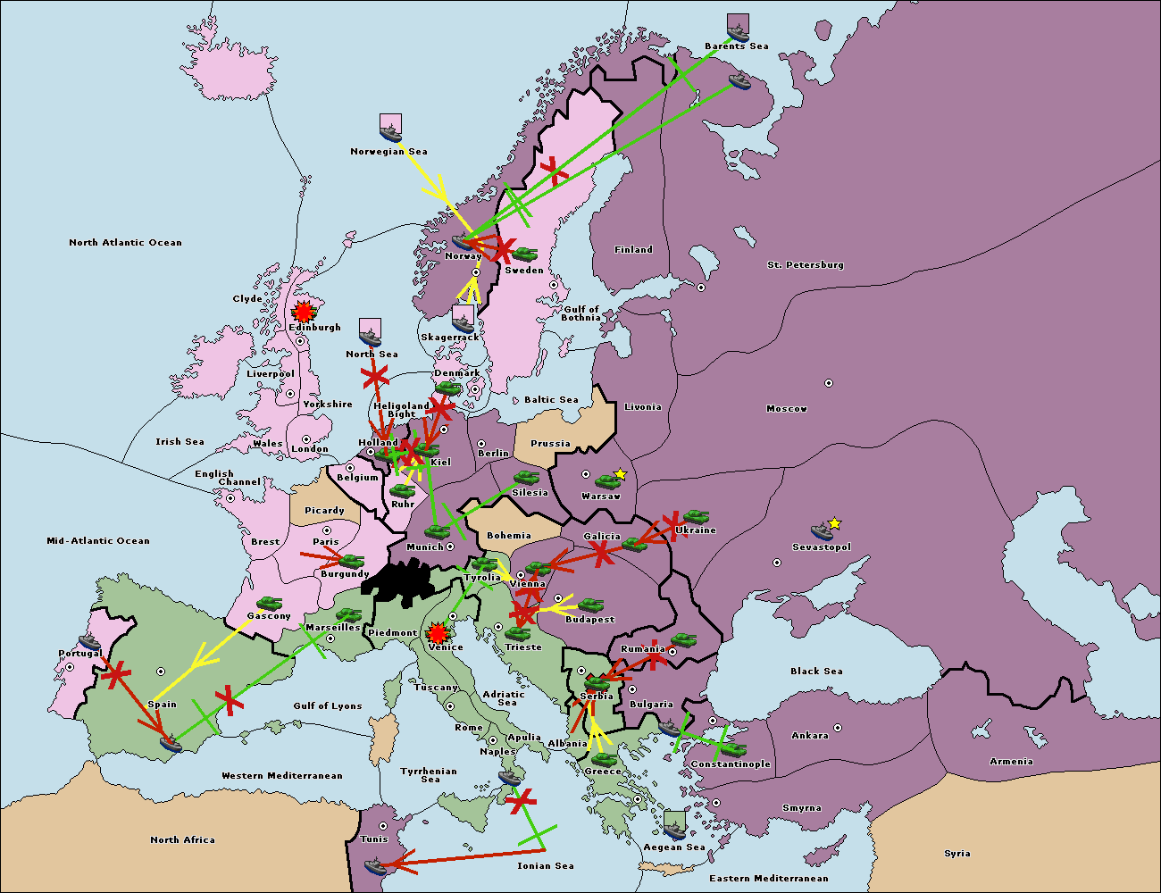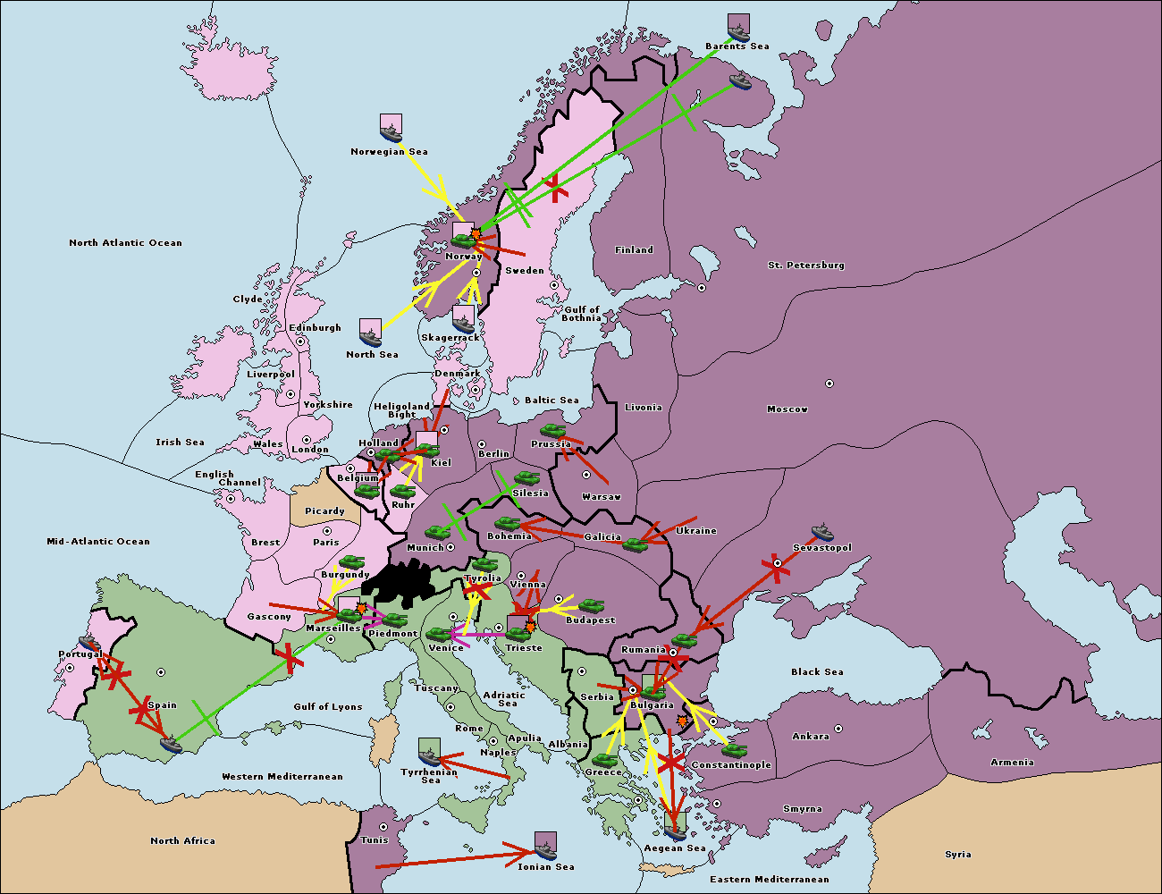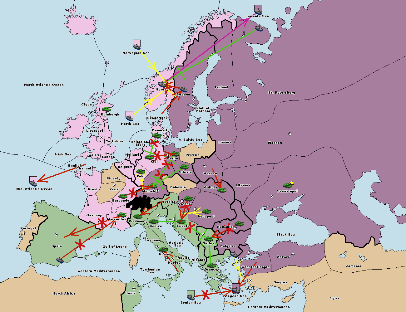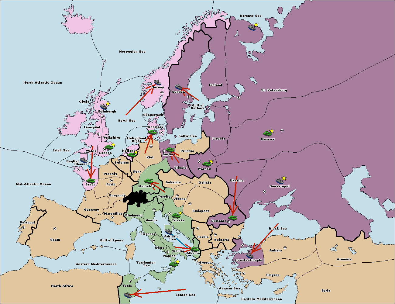 The fleet at Bulgaria (South Coast) support move to Greece from Aegean Sea.