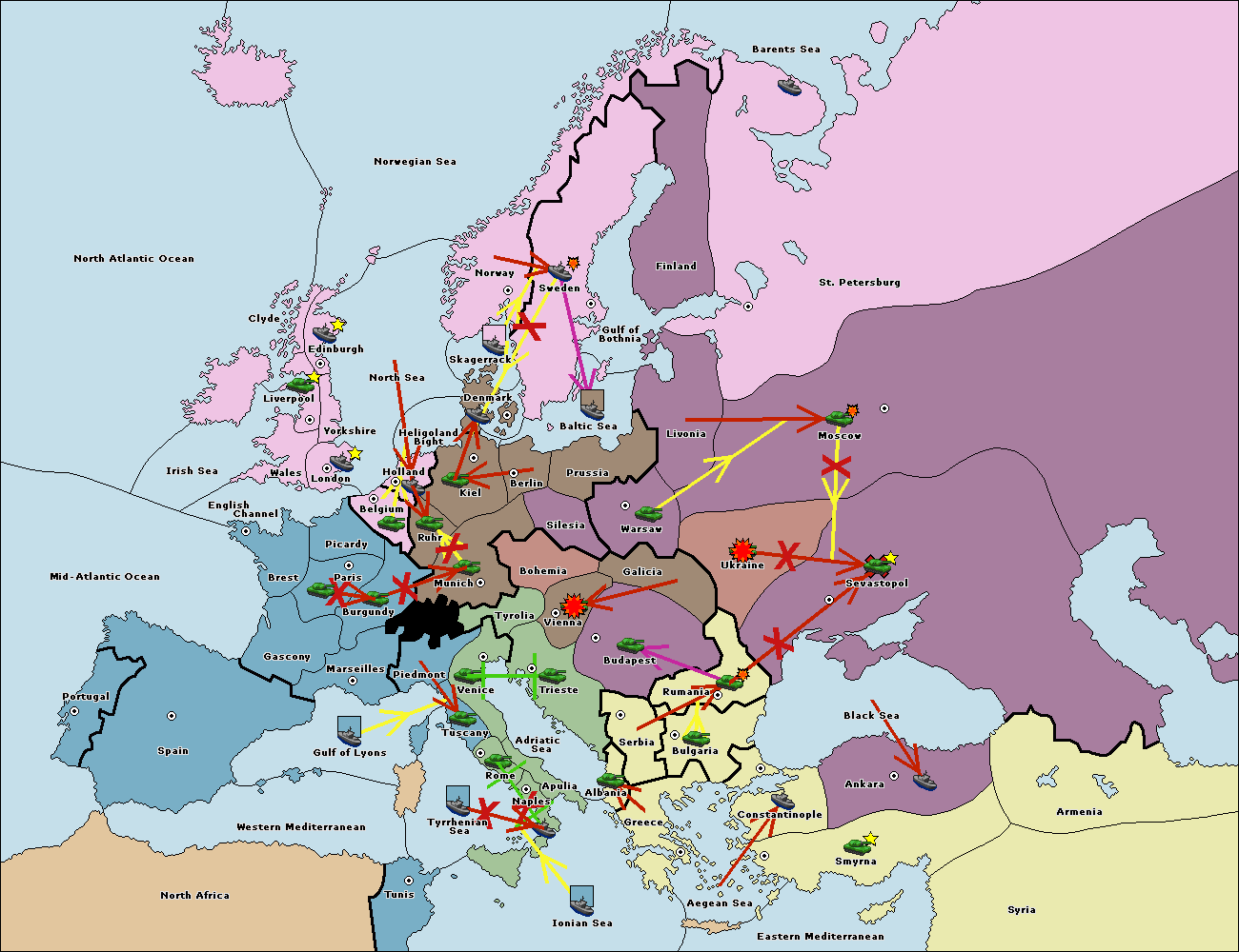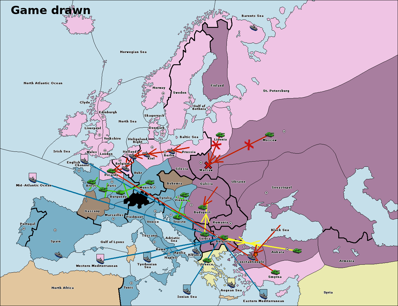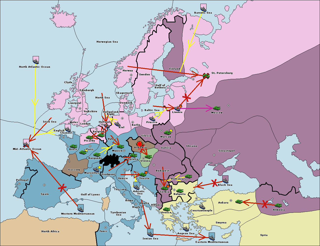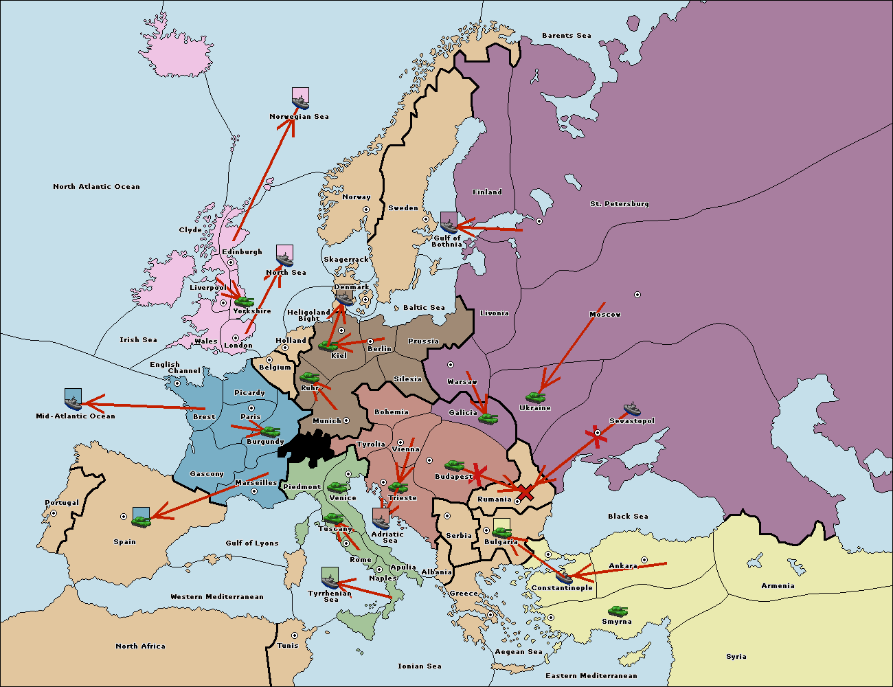 The fleet at Rumania support move to Bulgaria from Constantinople.