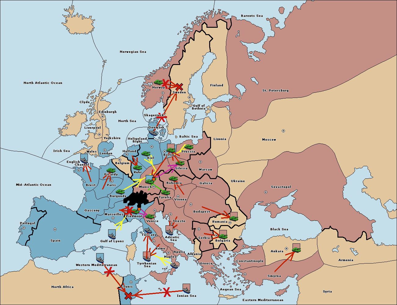 The fleet at Gulf of Lyons move to Tyrrhenian Sea.