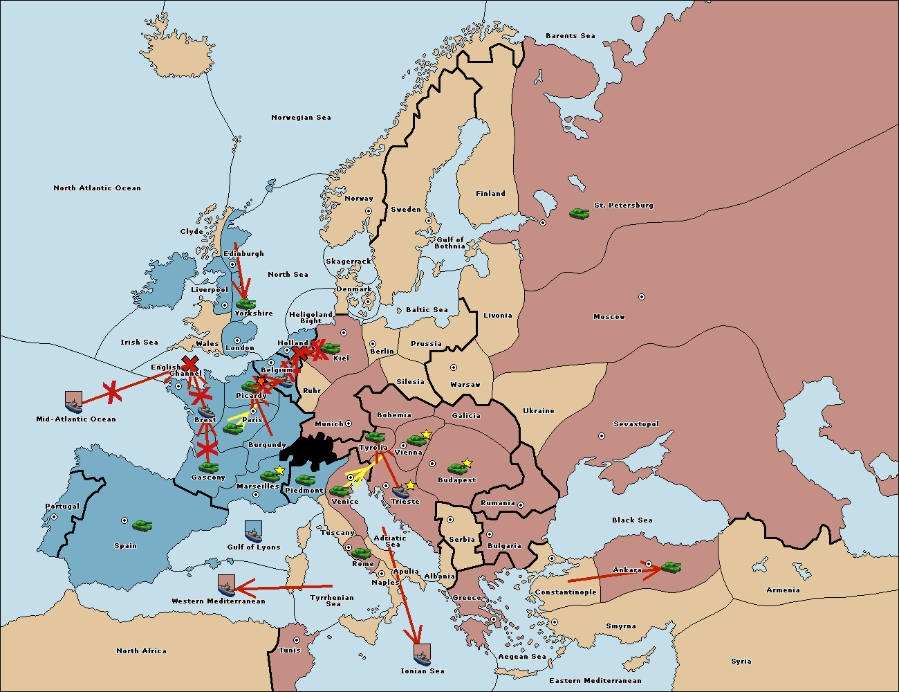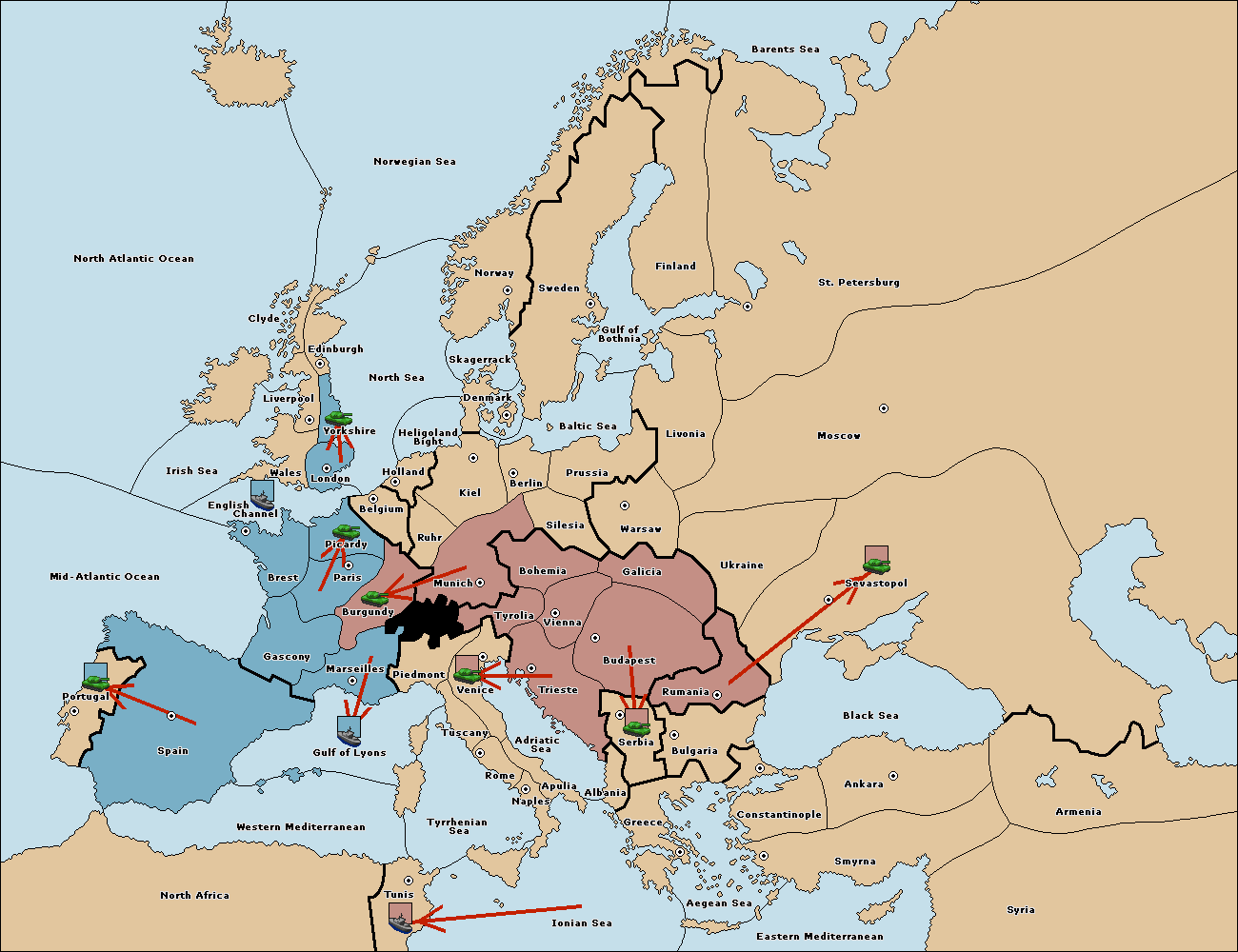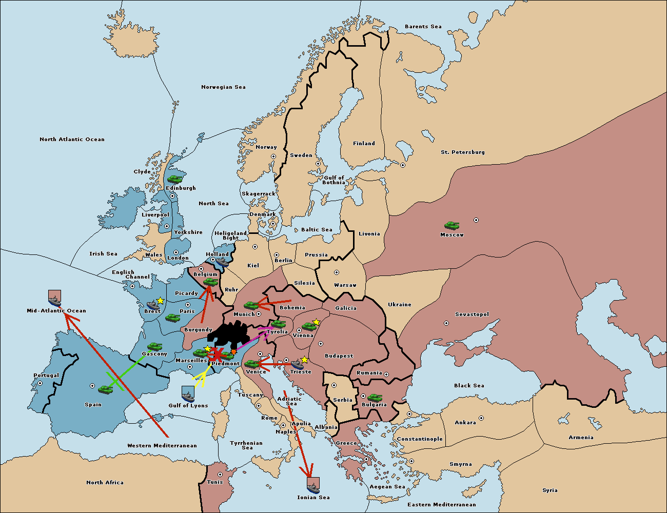 The fleet at Spain (South Coast) support move to Gulf of Lyons from Tyrrhenian Sea.