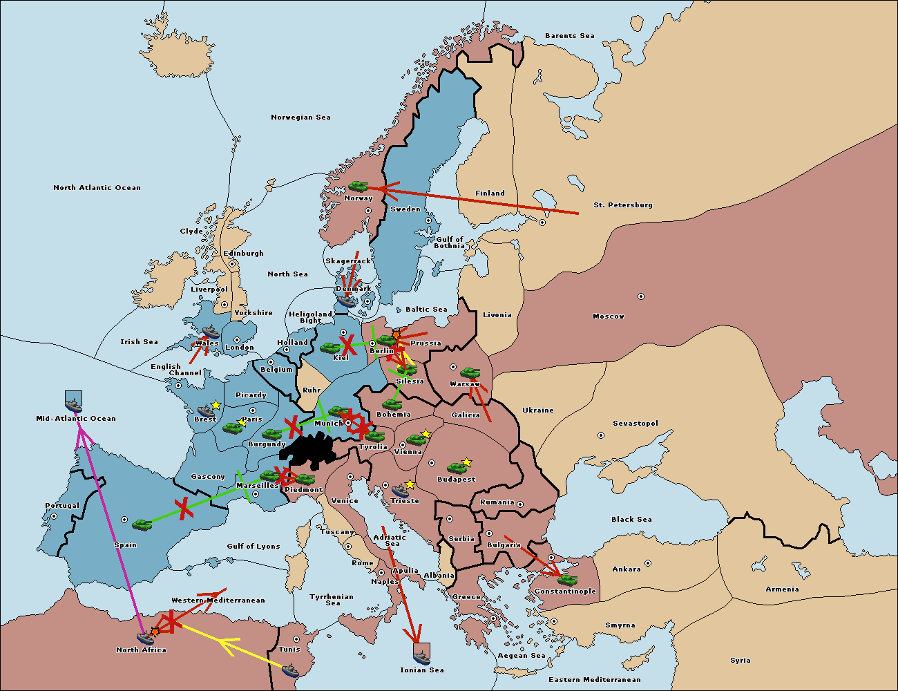 The fleet at North Africa move to Mid-Atlantic Ocean.
