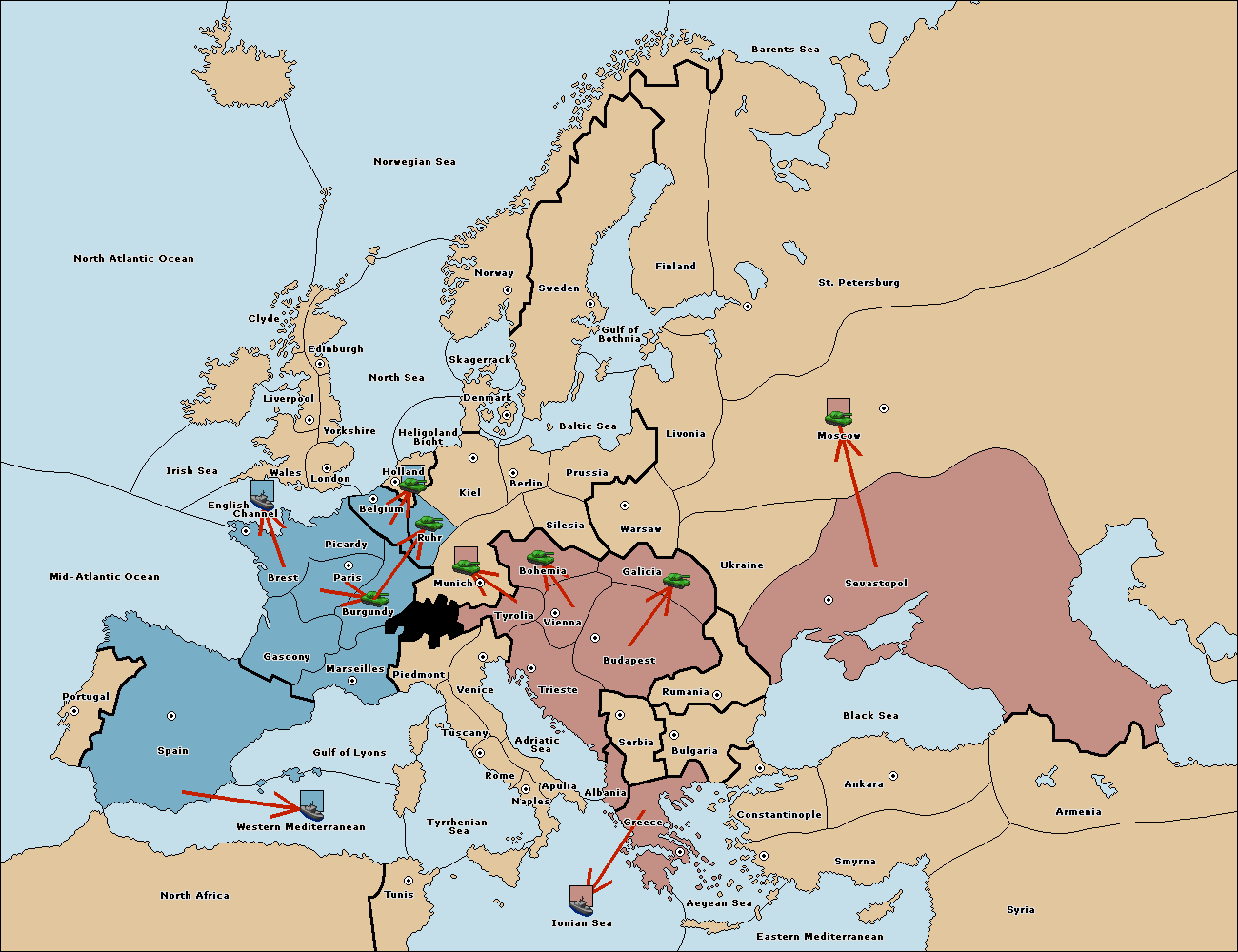 The fleet at Mid-Atlantic Ocean move to Western Mediterranean.