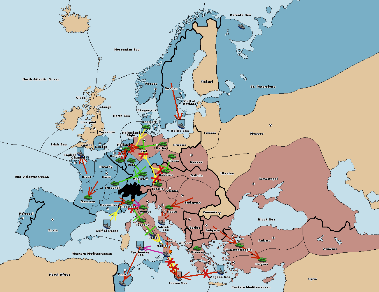 The fleet at Gulf of Lyons move to Tyrrhenian Sea.