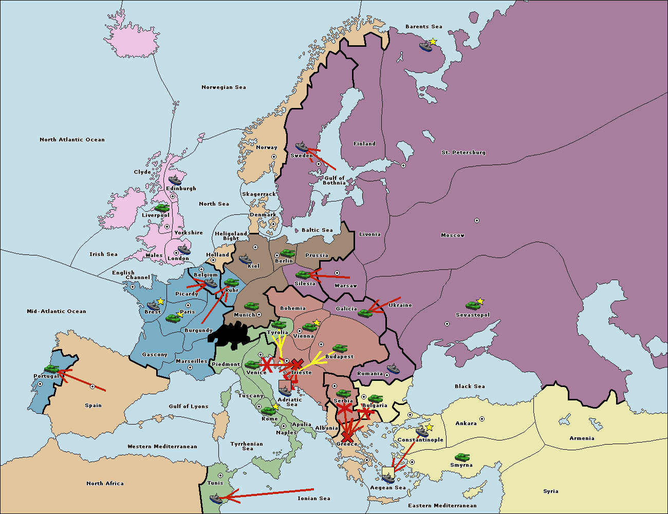 The army at Budapest support move to Trieste from Adriatic Sea.
