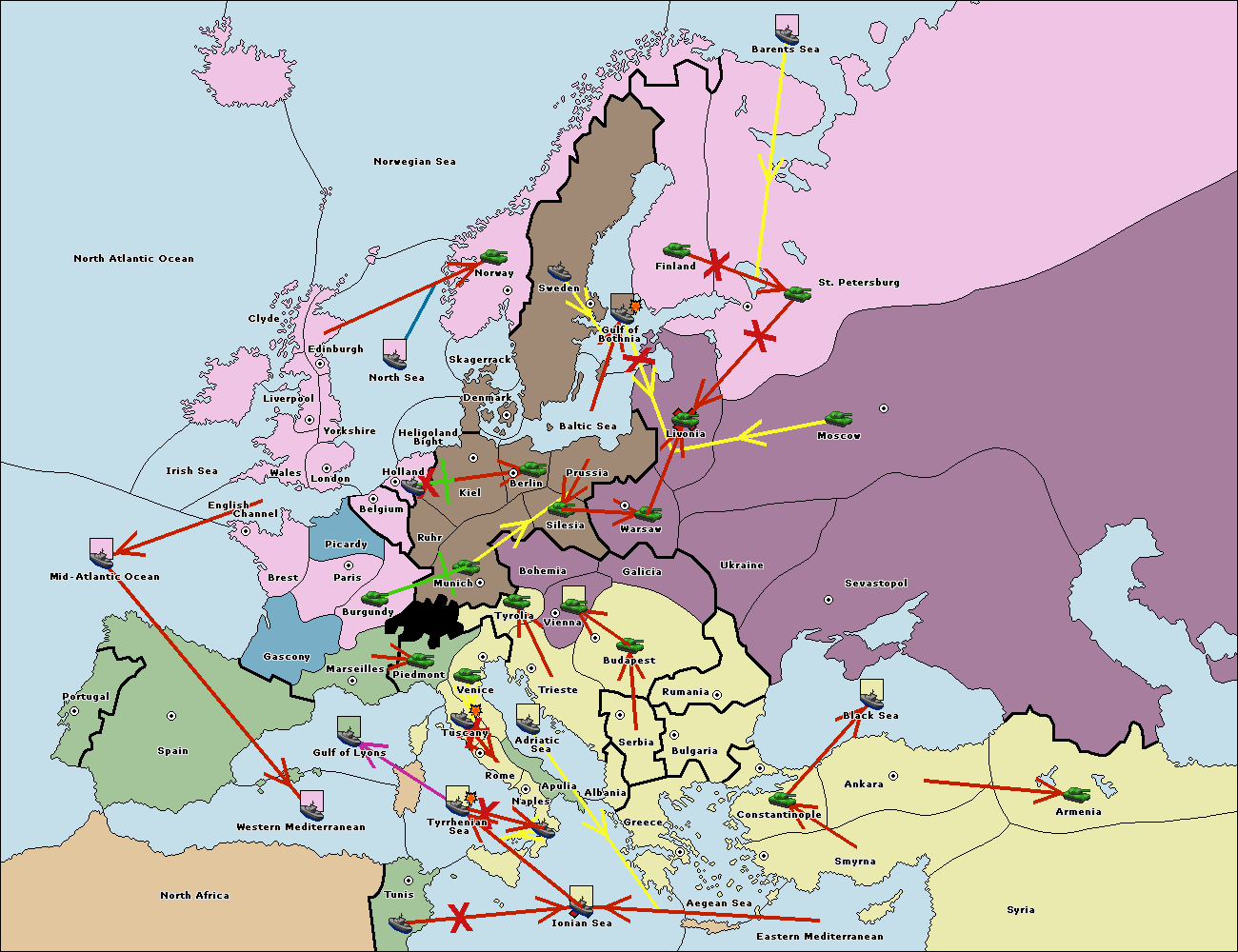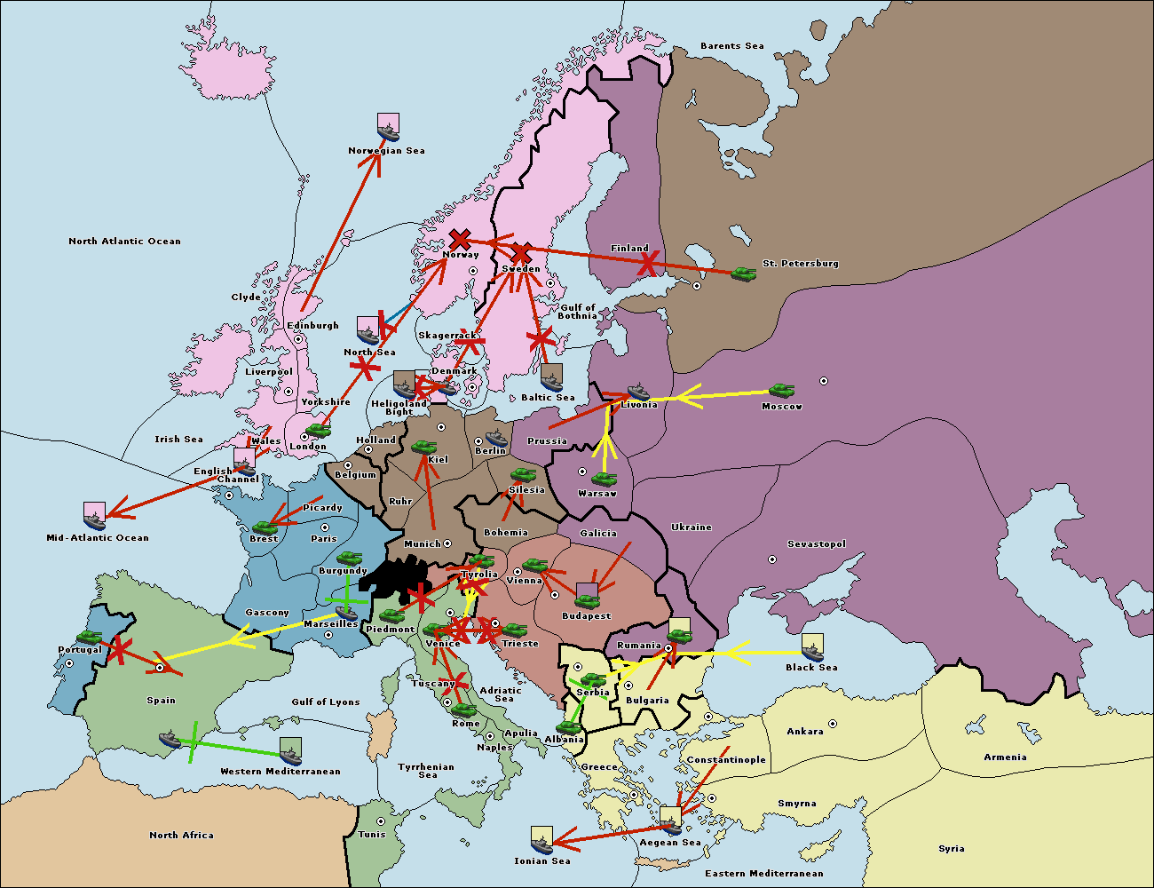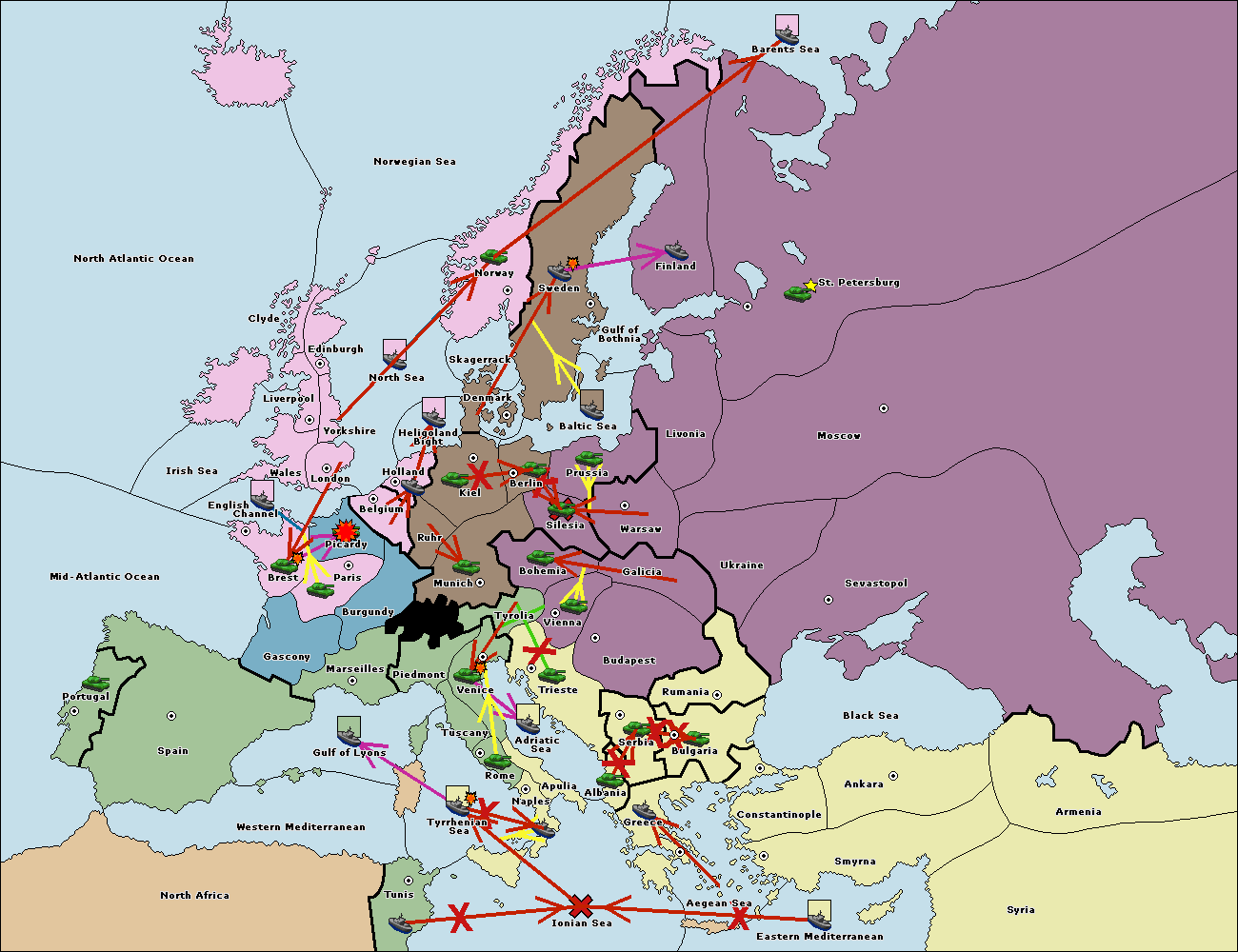 The fleet at Ionian Sea support move to Tyrrhenian Sea from Tunis.