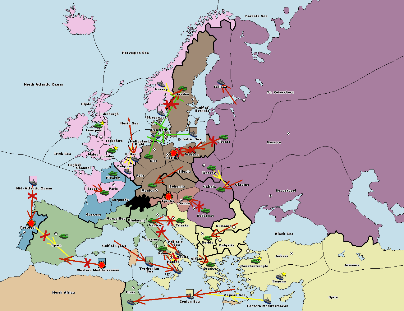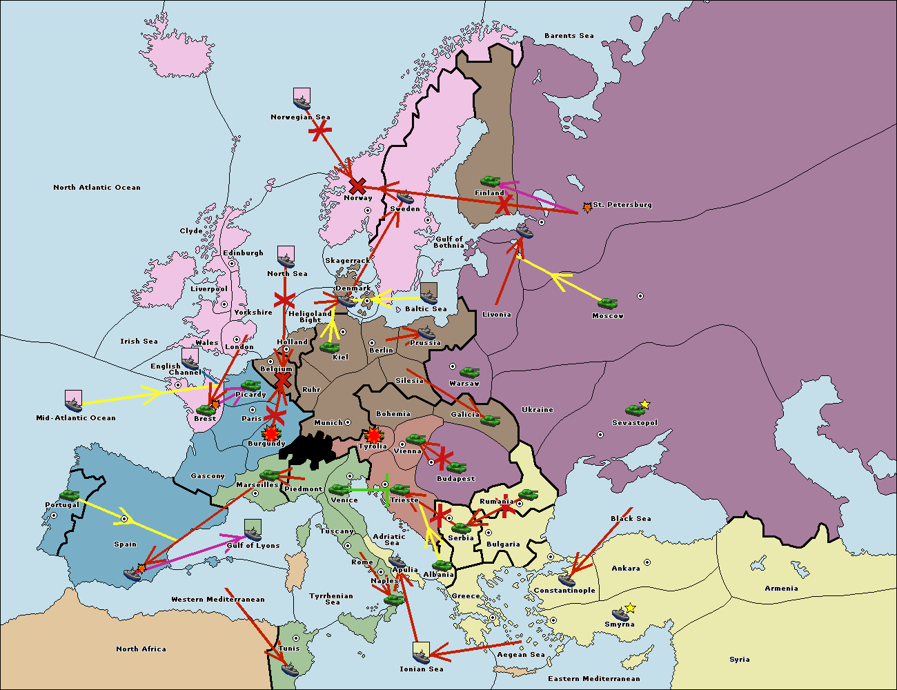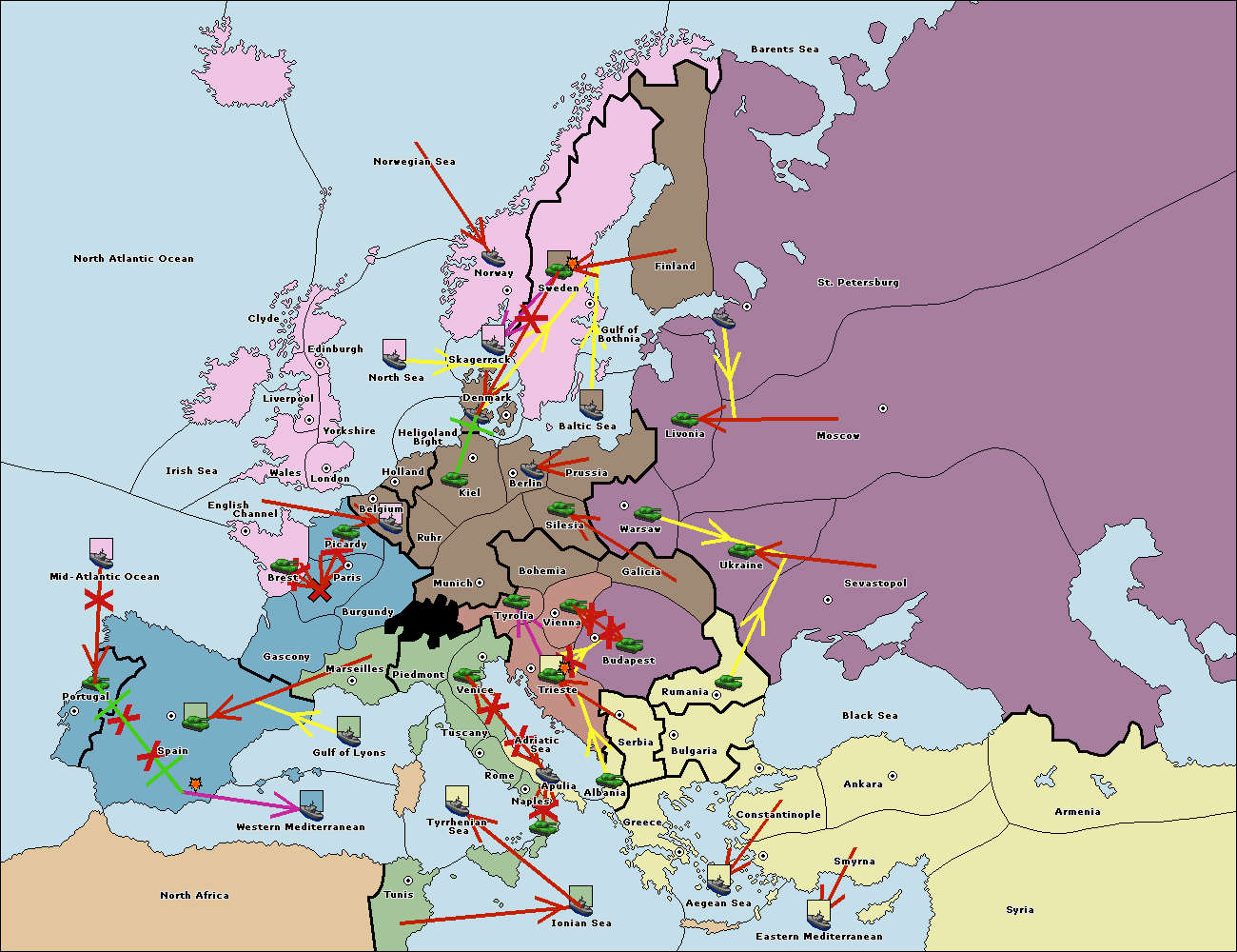 The fleet at Ionian Sea support move to Tyrrhenian Sea from Tunis.