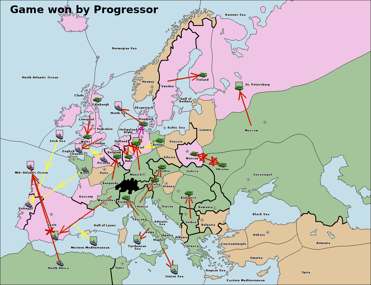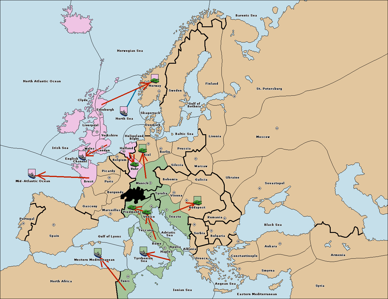 The fleet at North Africa move to Mid-Atlantic Ocean.