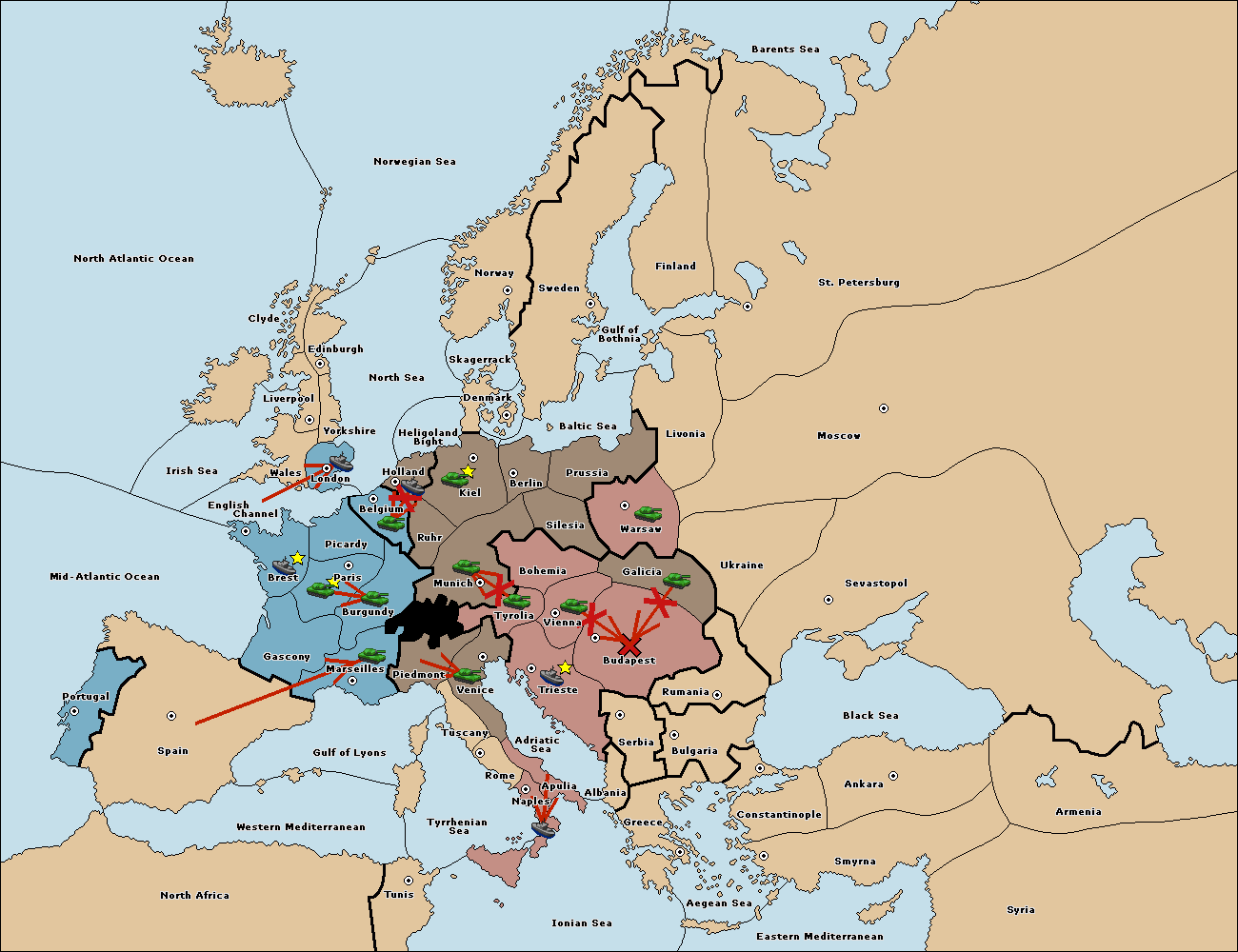 The army at Galicia move to Budapest.