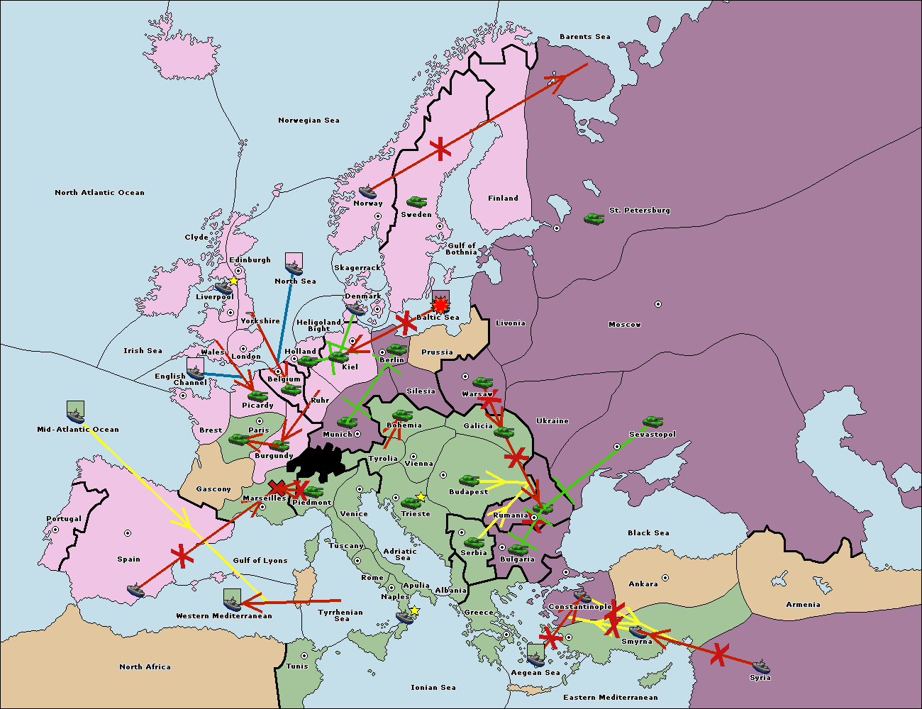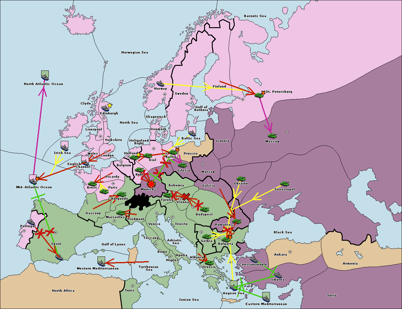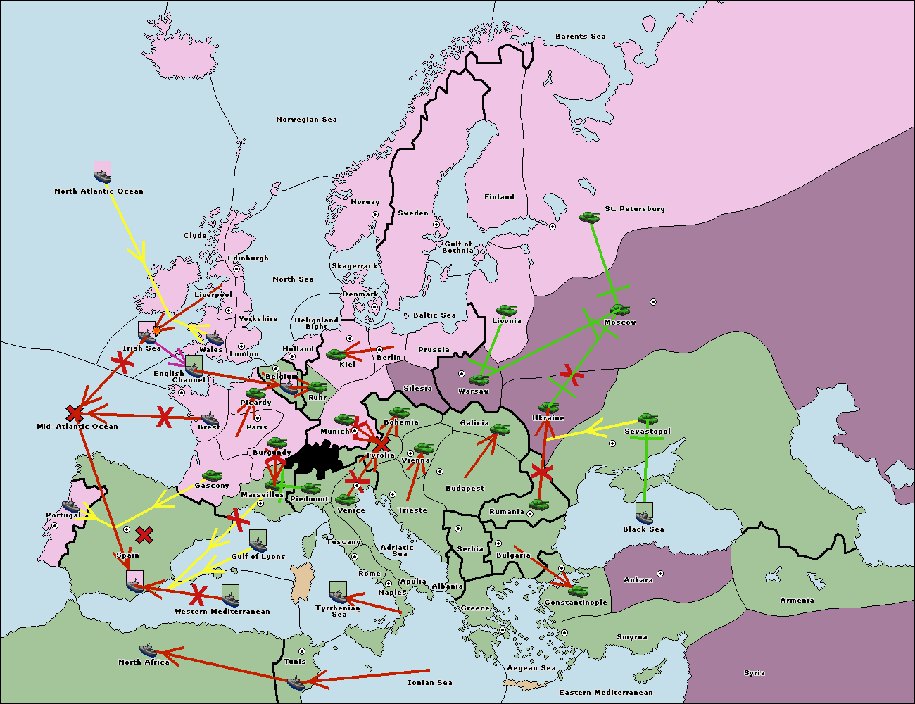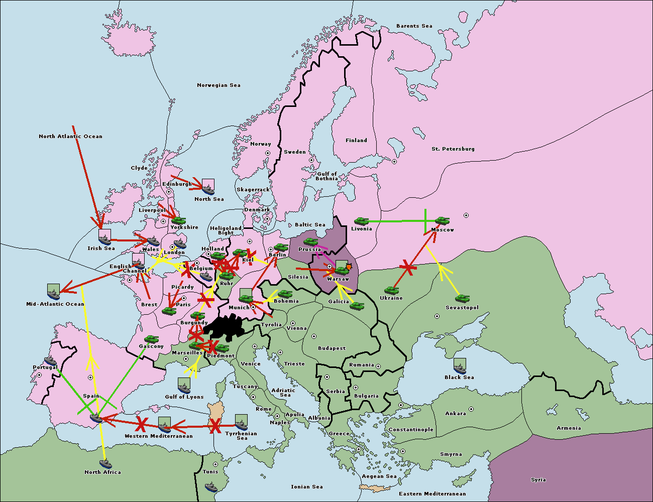 The fleet at Mid-Atlantic Ocean support move to Western Mediterranean from Tyrrhenian Sea.