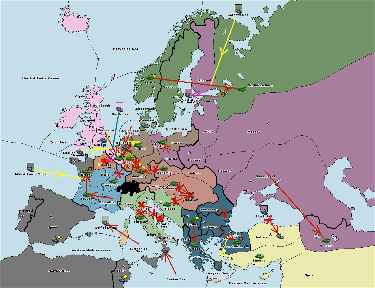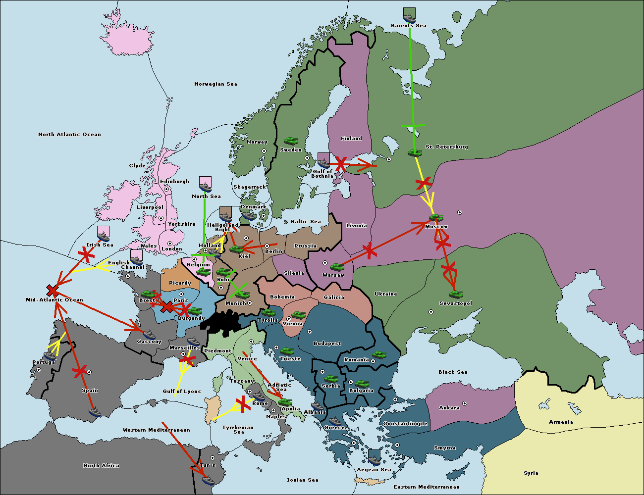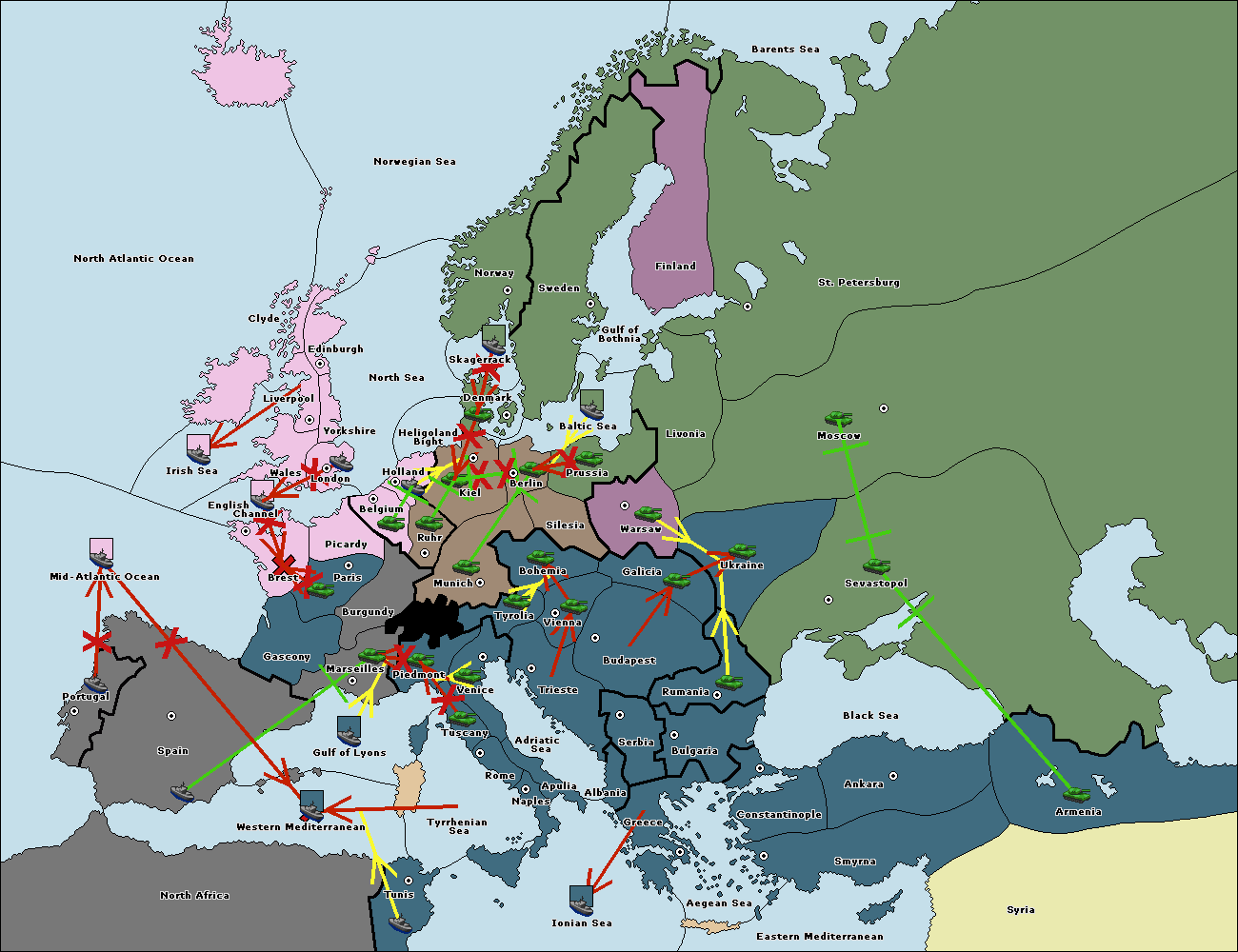 The fleet at Spain (South Coast) support move to Gulf of Lyons from Western Mediterranean.