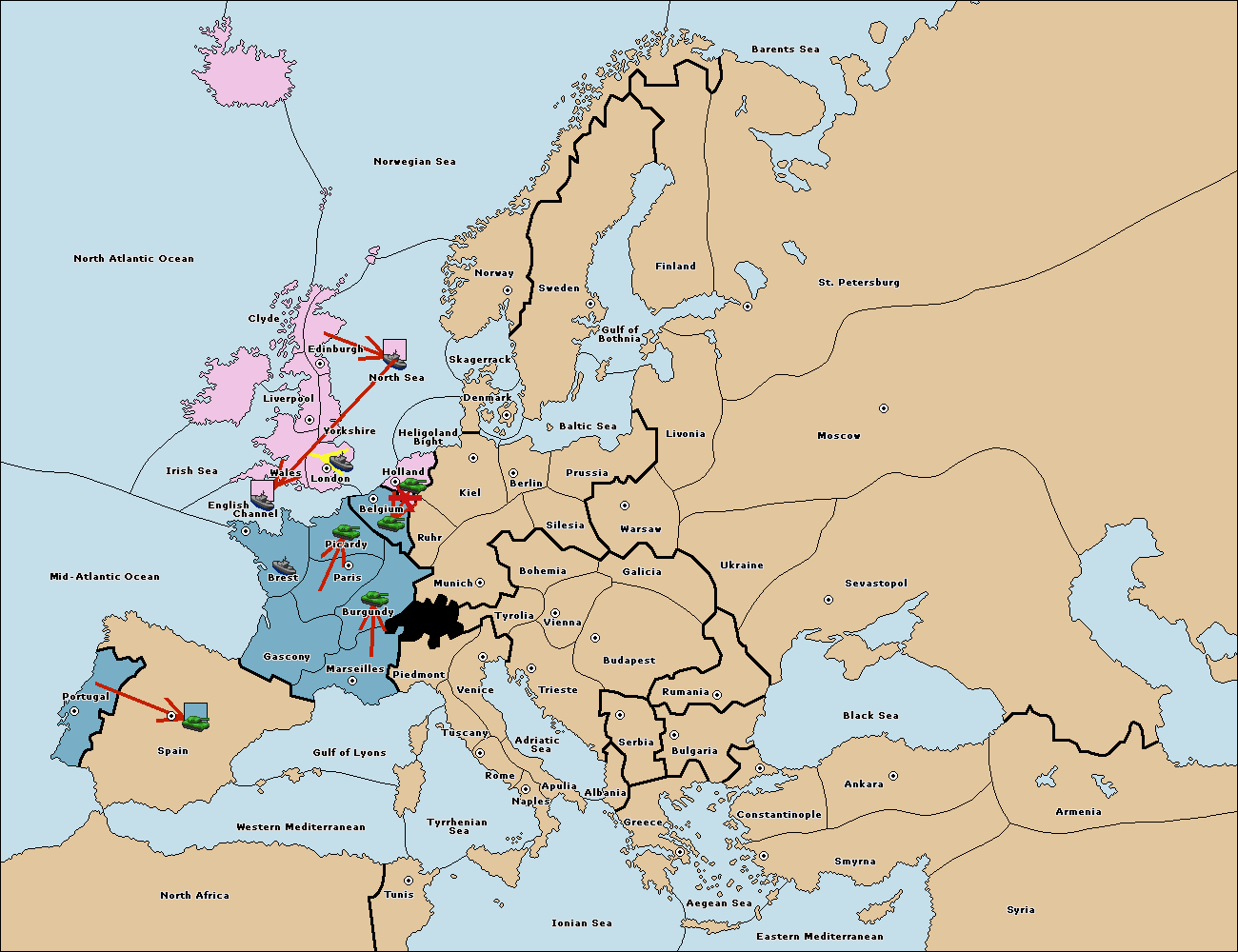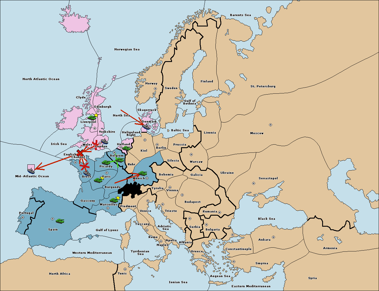 The fleet at Mid-Atlantic Ocean move to Western Mediterranean.