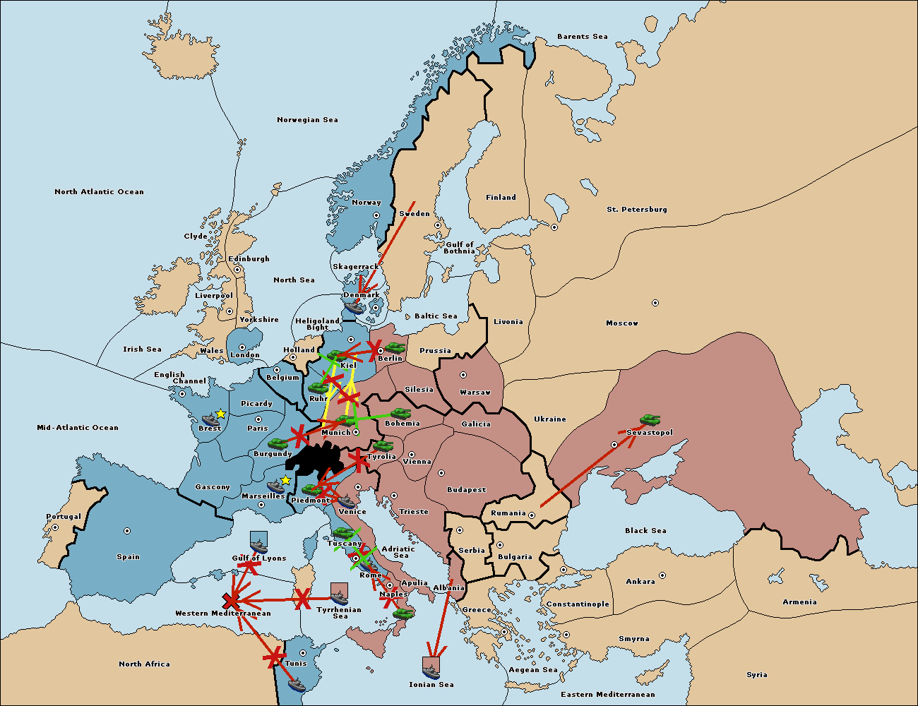 The fleet at Mid-Atlantic Ocean move to Western Mediterranean.
