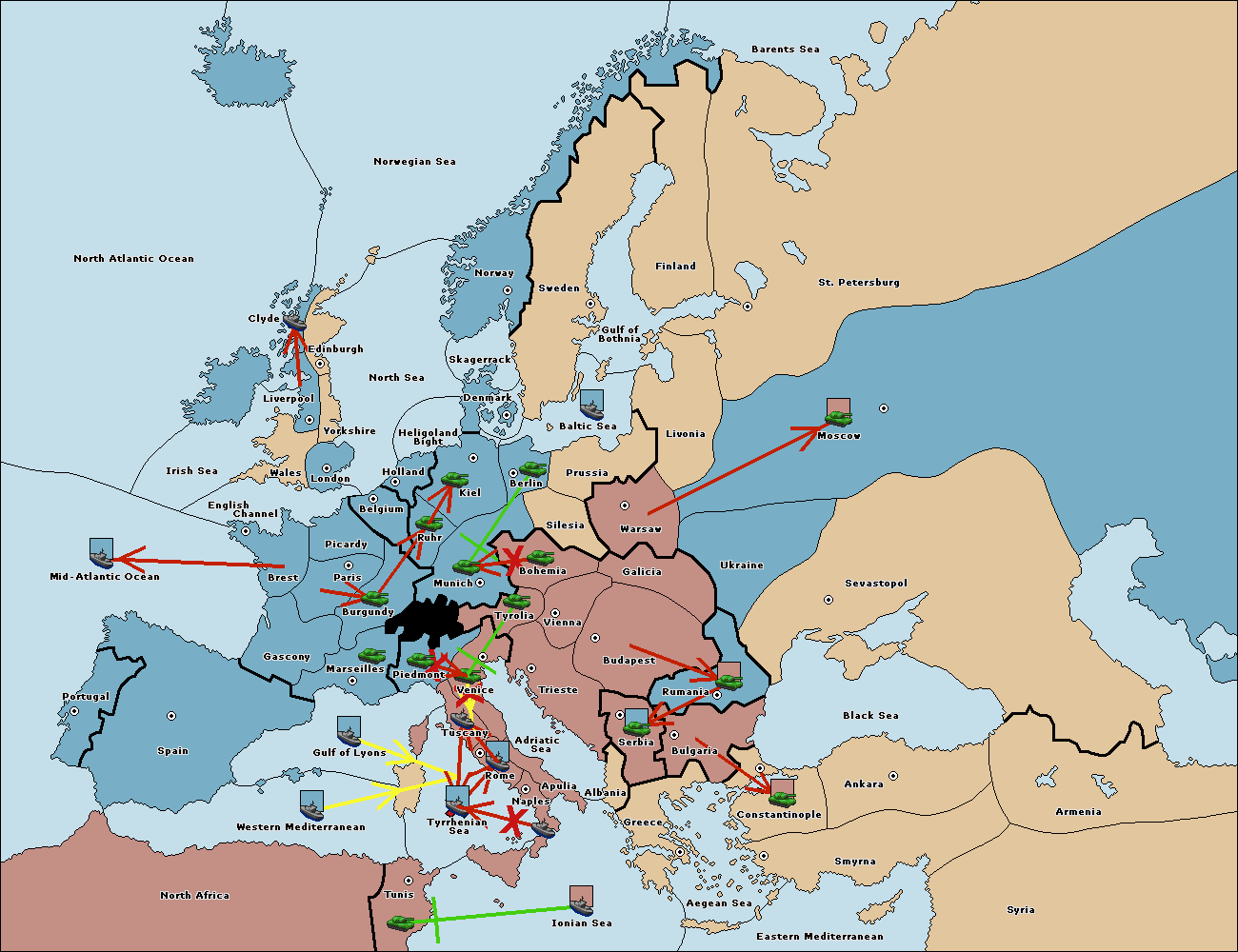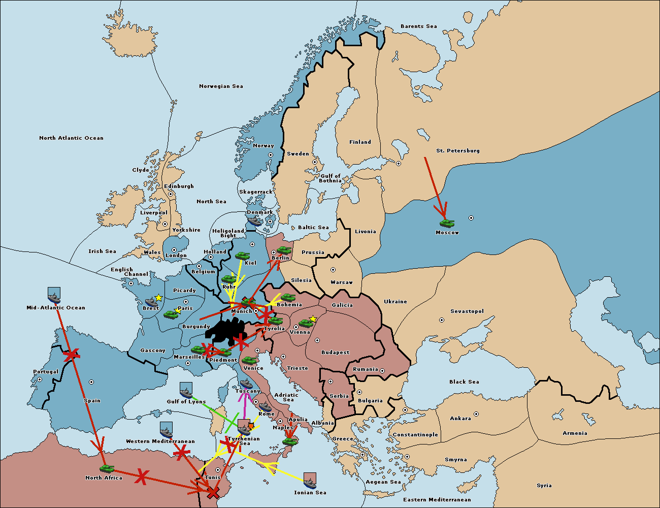 The fleet at Ionian Sea support move to Tyrrhenian Sea from Tunis.