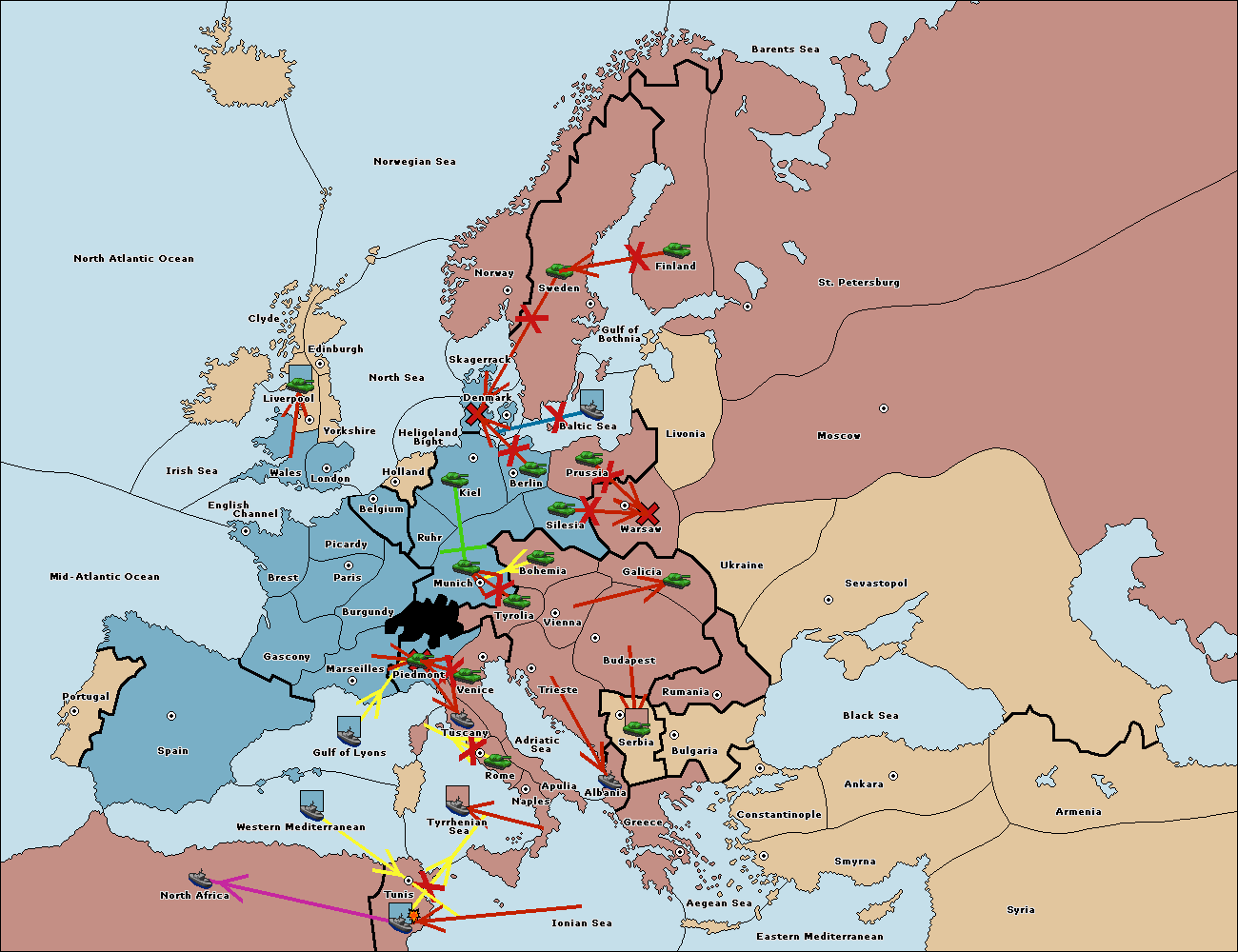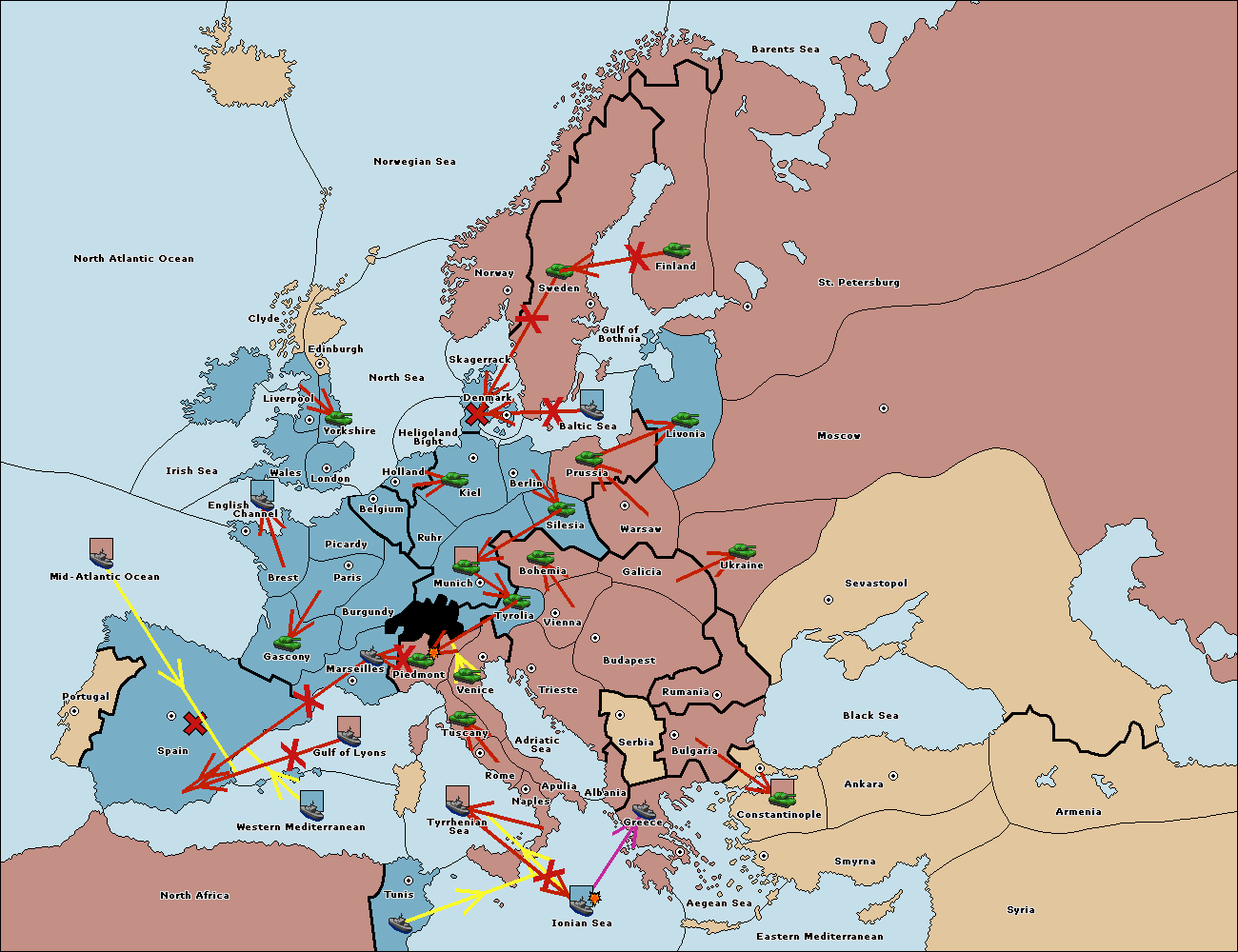 The fleet at Tyrrhenian Sea support move to Gulf of Lyons from Tuscany.