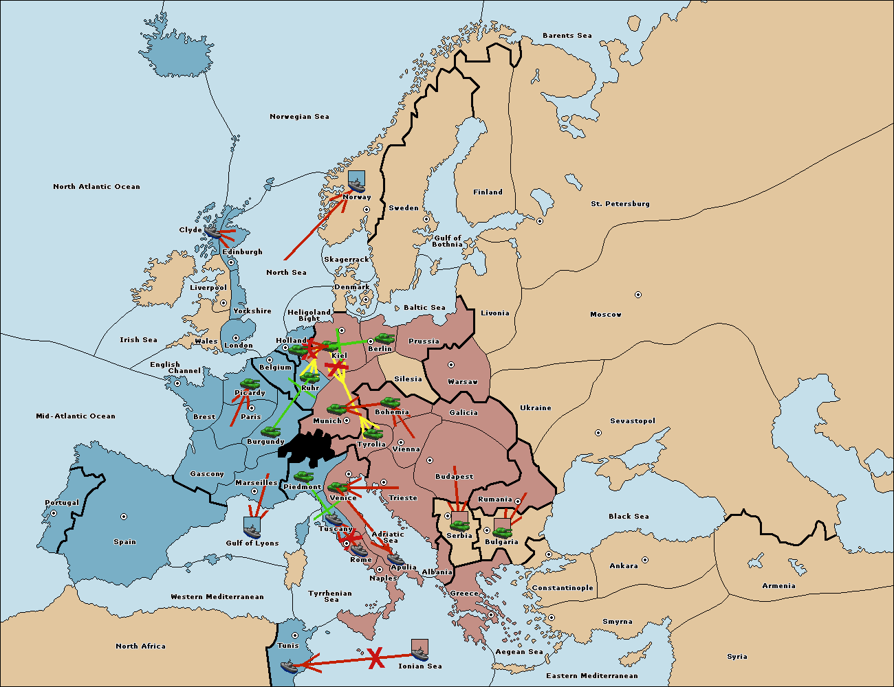 The fleet at Tyrrhenian Sea support move to Tunis from Ionian Sea.