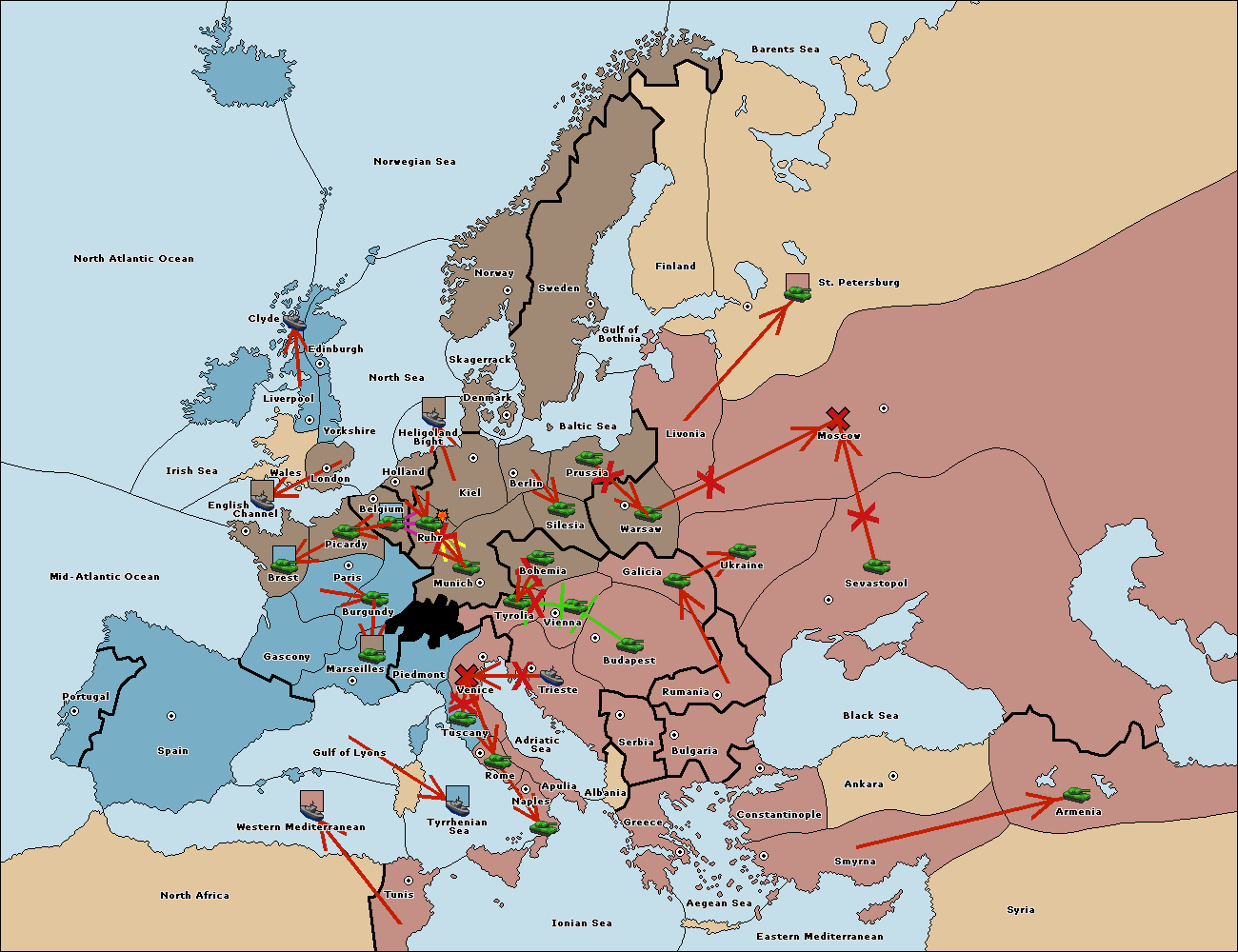 The army at Venice support move to Tyrolia from Trieste.